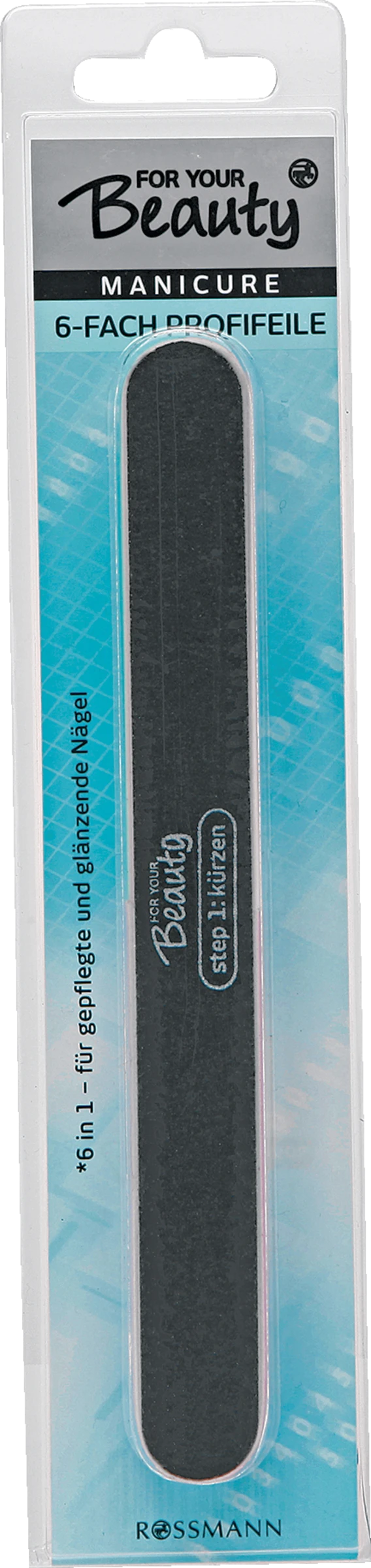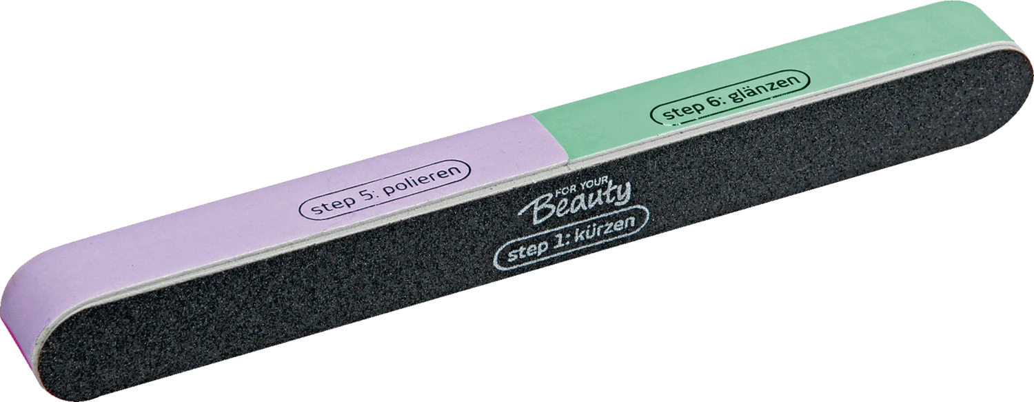 Die Profifeile bietet sechs verschiedene Körnungen, mit denen Sie Ihre Natur- oder Kunstnägel in Form bringen und auf Hochglanz polieren können.