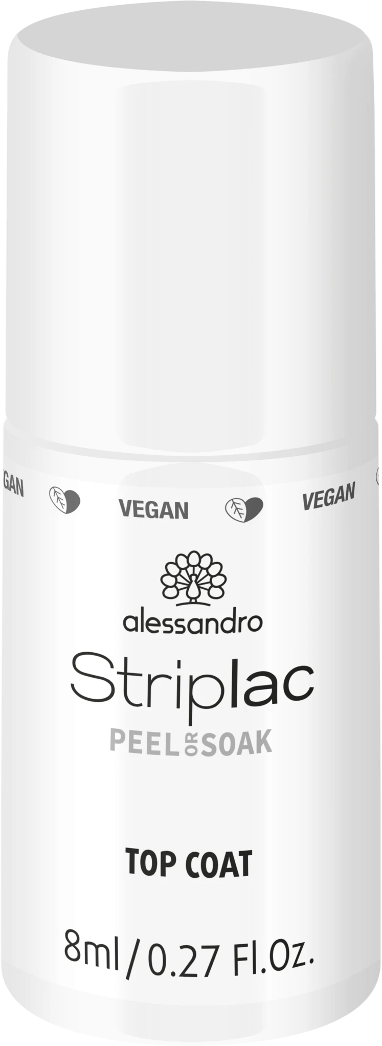 Der Top Coat ist ein unter LED aushärtender Überlack für alle Striplac-Farblacke. Dieser schützt den Farblack und sorgt für längeren Halt und Hochglanz bis zum letzten Tag!Das Beste– STRIPLAC ist VEGAN und TIERVERSUCHSFREI!• Für ein strahlend-glänzendes Finish: Der Top Coat verleiht jeder Peel or Soak Striplac-Lackierung den letzten Schliff und sorgt mit seinem starken Glanz für einen echten Wow-Effekt• Der Peel or Soak Top Coat versiegelt die Farblackierung mit nur einer Schicht langanhaltend und schützt den Nagel so vor Absplittern – für Hochglanz bis zum letzten Tag• Schluss mit lästiger Trocknungszeit: Der Top Coat härtet in nur 90 Sekunden unter dem alessandro LED-Lichtgerät aus und versiegelt dabei die Farblackierung – für langanhaltend glänzende NägelStriplac Peel or Soak ist das Must-Have für jede Frau, die Wert auf schöne Nägel legt! Nägel wie aus dem Nagelstudio in etwa 15 Minuten! Striplac ist ein einzigartiger Nagellack, der wesentlich länger hält als herkömmlicher Nagellack – bis zu drei Wochen. Hochglanz bis zum letzten Tag! Striplac kann einfach und streifenfrei aufgetragen werden, deckt bereits nach der ersten Anwendung, ist kratz- und splitterfest. Keine lästige Trockenzeit, denn Striplac härtet in 60 Sekunden im LED-Gerät. Das Ergebnis ist eine perfekte LED-Maniküre wie aus dem Nagelstudio. Das Beste– STRIPLAC ist VEGAN und TIERVERSUCHSFREI!Zum schnellen Ablösen gibt es zwei Möglichkeiten: Schnelle Peel-Off or Soak-Off Lösung. Durch den Peel-Off Aktivator lässt sich der Striplac einfach vom Nagel abziehen oder Sie nutzen die Soak-Off Remover Wraps zum Ablösen. Der Lack ist mit beiden Lösungen rückstandslos zu entfernen.