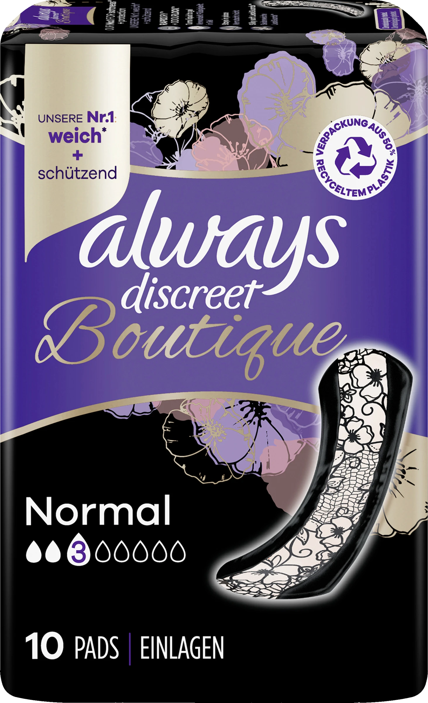 Mit Always Discreet Boutique Inkontinenz-Einlagen können Sie Ihr Leben trotz Blasenschwäche in vollen Zügen genießen. Entdecken Sie den unglaublichen Schutz der Always Discreet Boutique Inkontinenz-Einlagen. Das feminine Design und das stoffähnliche Material sorgen dafür, dass die Einlagen so wie Ihre Unterwäsche aussehen, sitzen und sich anfühlen. Die Einlagen verwandeln Flüssigkeit in Gel und absorbieren Feuchtigkeit sofort, sodass Sie sich frisch und sicher fühlen, egal was passiert. Mit Always Discreet Boutique können Sie sich mit Selbstvertrauen bewegen, ohne dass Ihre Blasenschwäche Sie beeinträchtigt.