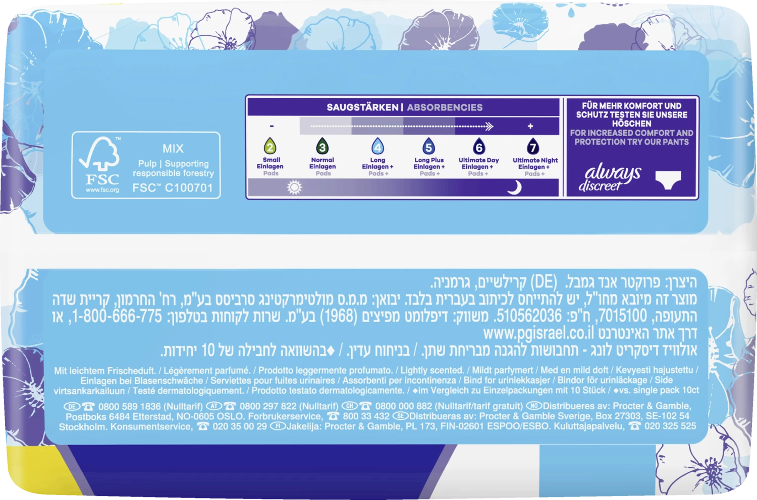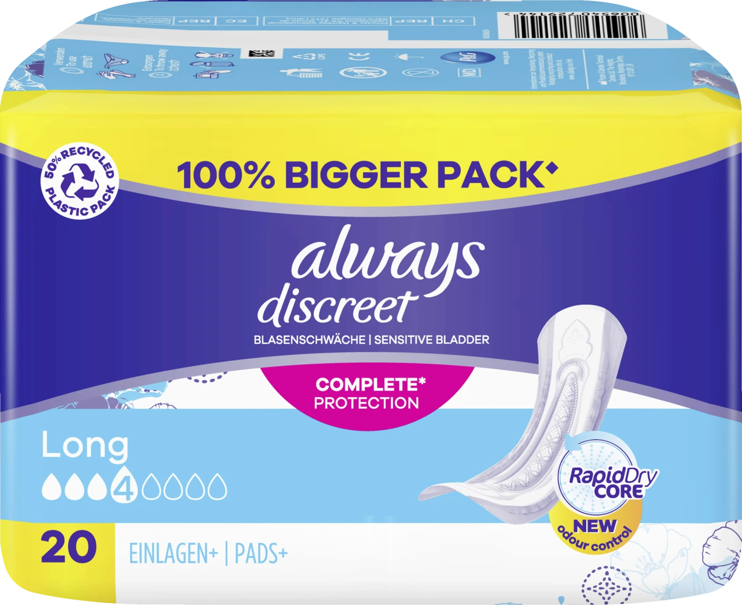 Die Always Discreet Inkontinenzeinlagen Long bieten Ihnen Rundumschutz und eine diskrete Passform. Jede Einlage ist so konzipiert, dass sie zuverlässigen Schutz vor Auslaufen, Geruchskontrolle, sofortiges Trocknen und ein weiches, sanftes Gefühl auf der Haut bietet, während sie sich diskret an Ihren Körper anpasst. Wenn Niesen oder Lachen zu Blasenschwäche führt, bieten die Always Discreet Einlagen Long einen starken Schutz und die gewünschte Diskretion, damit Sie sich sicher fühlen können.