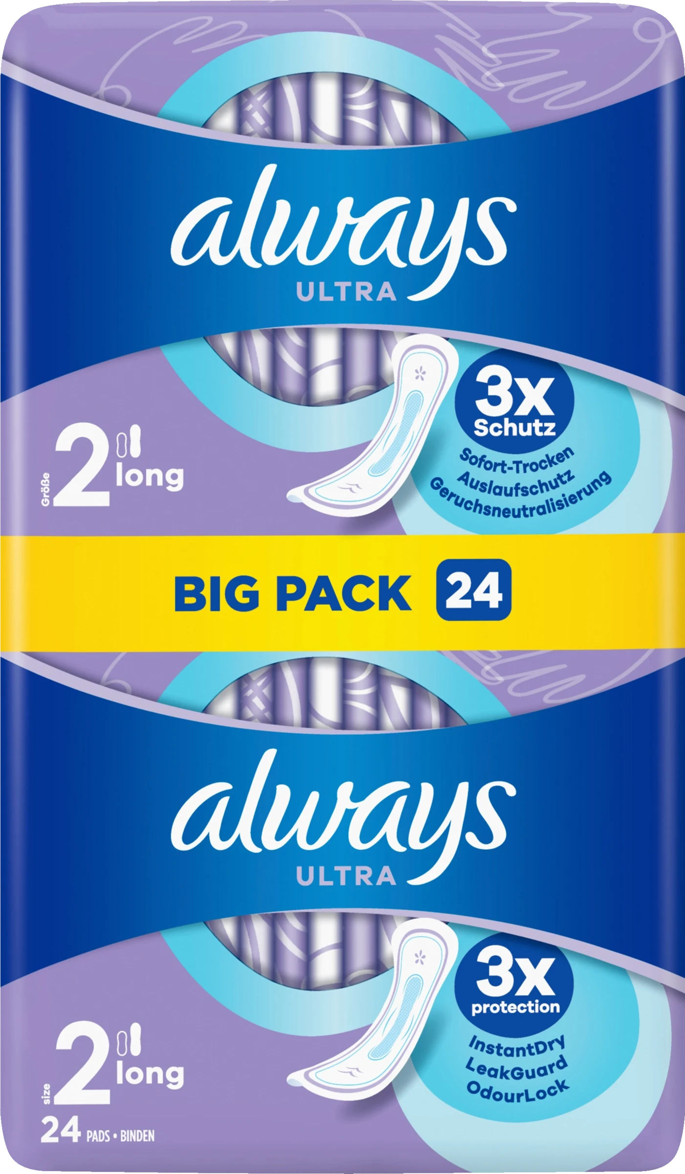 Geben Sie sich mit nicht weniger als 3-fachem Schutz zufrieden: ALWAYS Ultra Long (Größe 2) Damenbinden verwenden die neueste Technologie, um eine multifunktionale Binde mit 3 Schutzfunktionen zu bieten. Das InstantDry-System absorbiert Flüssigkeit in Sekunden und hält Feuchtigkeit von der Haut fern. LeakGuards schließen die Flüssigkeit ein und verhindert das Auslaufen. Die OdourLock-Technologie neutralisiert Gerüche, sodass Sie sich während Ihrer Periode frisch und sauber fühlen. Mit ALWAYS Ultra fühlen Sie sich gut geschützt und können selbstbewusst durch den Tag gehen. Holen Sie sich den 3-fachen Schutz von Always!