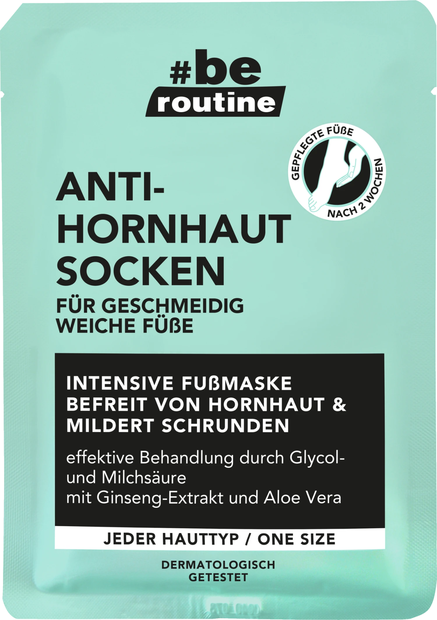 Füße von Nagellack und Fußschmuck befreien, waschen und trocknen. Socken aus dem Sachet nehmen und an der Siegelnaht aufschneiden. Socken anziehen und dabei die Füße zwischen die beiden Fleecelagen stecken. Mit dem Klebestreifen verschließen, sodass das Gel nicht auslaufen kann. Die Maske 30-60 Minuten (je nach Verhornungsintensität) einwirken lassen. Einwirkungszeit nicht überschreiten. Achtung: Rutschgefahr. Socken entfernen und Füße gründlich mit einer milden Seife waschen. Füße anschließend mit einer reichhaltigen Fußpflegecreme pflegen. Nach 2-7 Tagen beginnt der Peeling-Prozess, bei dem sich die überschüssige Hornhaut ablöst und die hornhautfreie Haut zum Vorschein kommt.