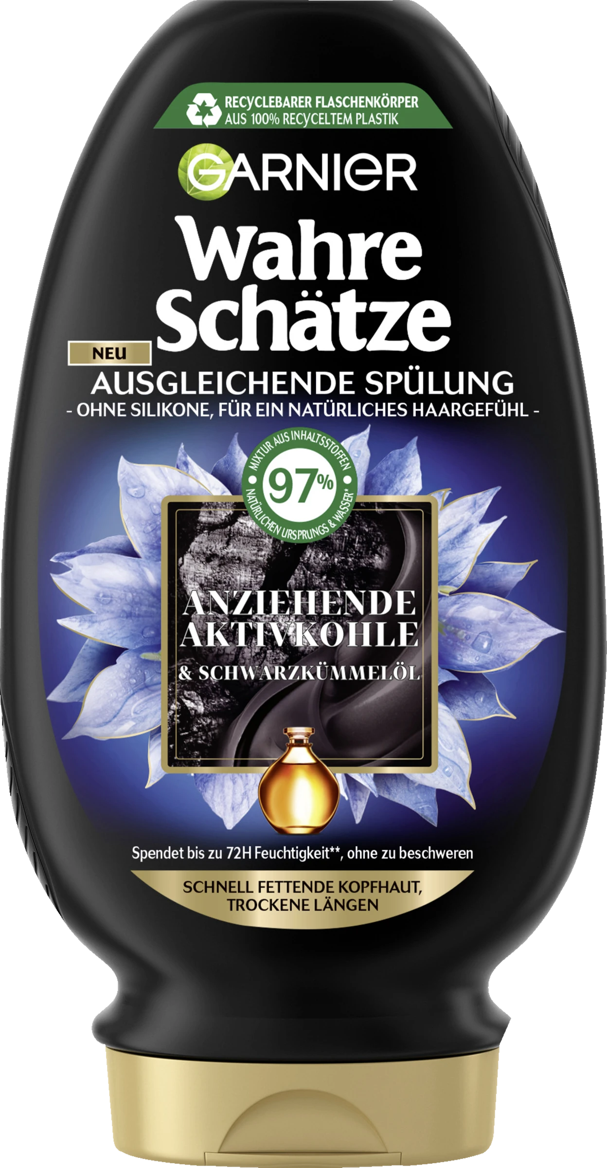 Die Wahre Schätze Ausgleichende Spülung von Garnier eignet sich speziell für die Bedürfnisse von schnell fettender Kopfhaut und zu Trockenheit neigenden Haaren. Dafür zeichnet sich der Conditioner durch reinigende und feuchtigkeitsspendende Eigenschaften aus, um die Haarlängen langanhaltend zu hydratisieren – für mehr Geschmeidigkeit. Angereichert ist die Formel mit Aktivkohle und Schwarzkümmelöl. Diese wirken reinigend und versorgen die Haare bis zu 72 Stunden mit Feuchtigkeit, ohne zu beschweren oder zu fetten. Die Mixtur aus 97% an Inhaltsstoffen natürlichen Ursprungs sowie Wasser entwirrt sofort und verleihen den Haaren einen gesunden Glanz.