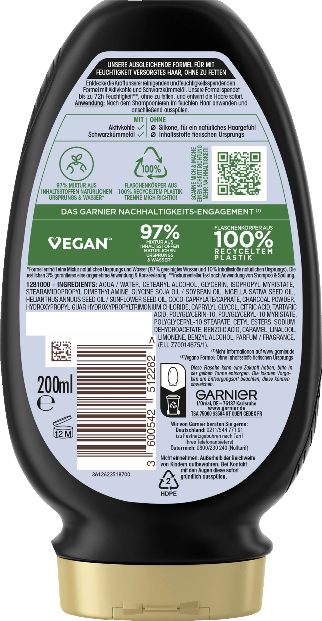 Aqua / Water • Cetearyl Alcohol • Glycerin • Isopropyl Myristate • Stearamidopropyl Dimethylamine • Glycine Soja Oil / Soybean Oil • Nigella Sativa Seed Oil • Helianthus Annuus Seed Oil / Sunflower Seed Oil • Coco-Caprylate/Caprate • Charcoal Powder • Hydroxypropyl Guar Hydroxypropyltrimonium Chloride • Caprylyl Glycol • Citric Acid • Tartaric Acid • Polyglycerin-10 • Polyglyceryl-10 Myristate • Polyglyceryl-10 Stearate • Cetyl Esters • Sodium Dehydroacetate • Benzoic Acid • Caramel • Linalool • Limonene • Benzyl Alcohol • Parfum / Fragrance (F.I.L. Z70014675/1)