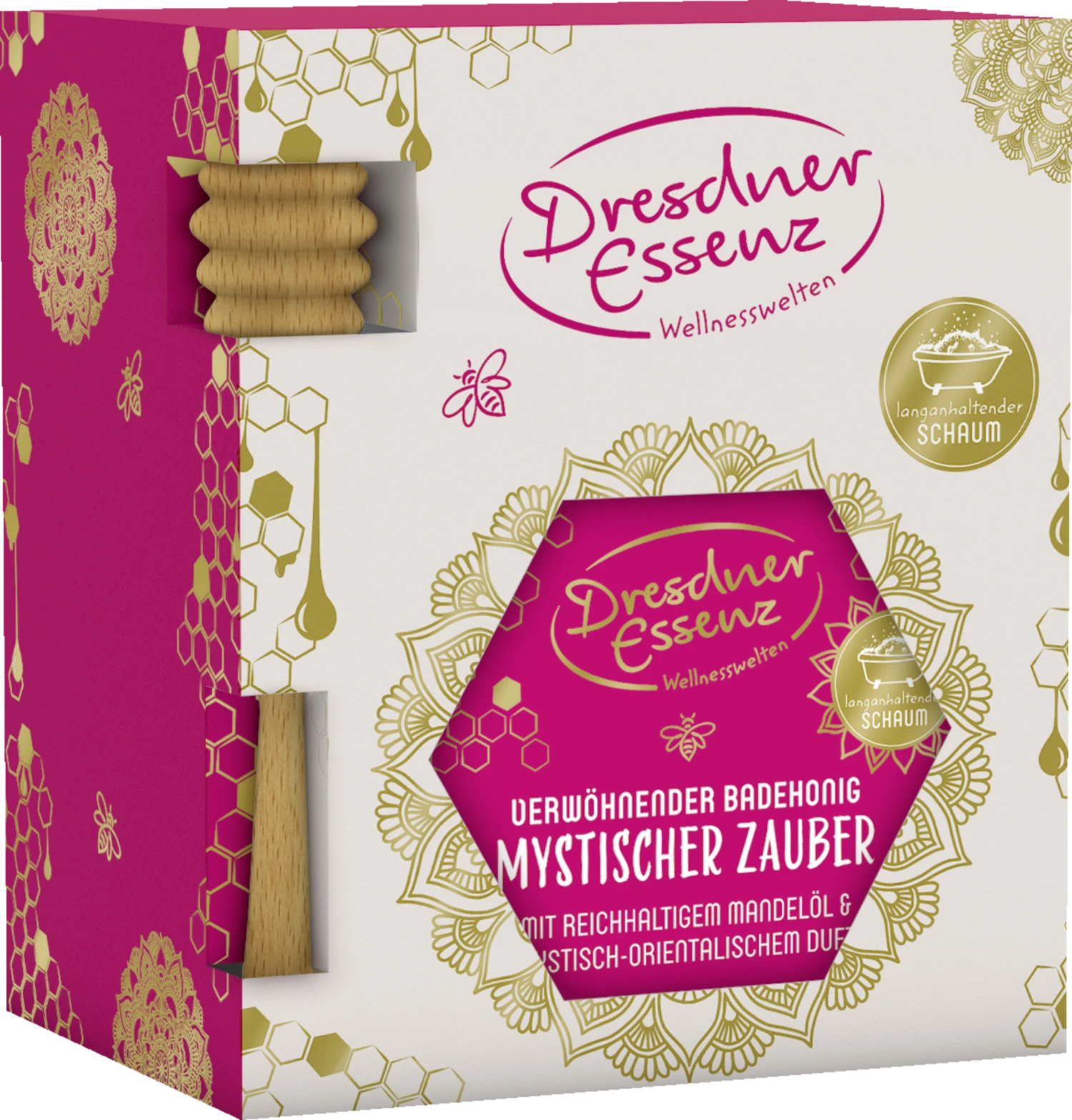 Schwelgen Sie mit dem Badehonig MYSTISCHER ZAUBER in purem Luxus. Die reichhaltig-cremige Textur macht das Baden zu einem ganz besonderen Erlebnis. Eine hochwertige Rezeptur mit reichhaltigem Mandelöl, pflegendem Honig und Weizenprotein verleiht ein gepflegtes Hautgefühl. Der sinnliche, orientalisch anmutende Duft wirkt beruhigend und harmonisierend auf Körper und Geist.