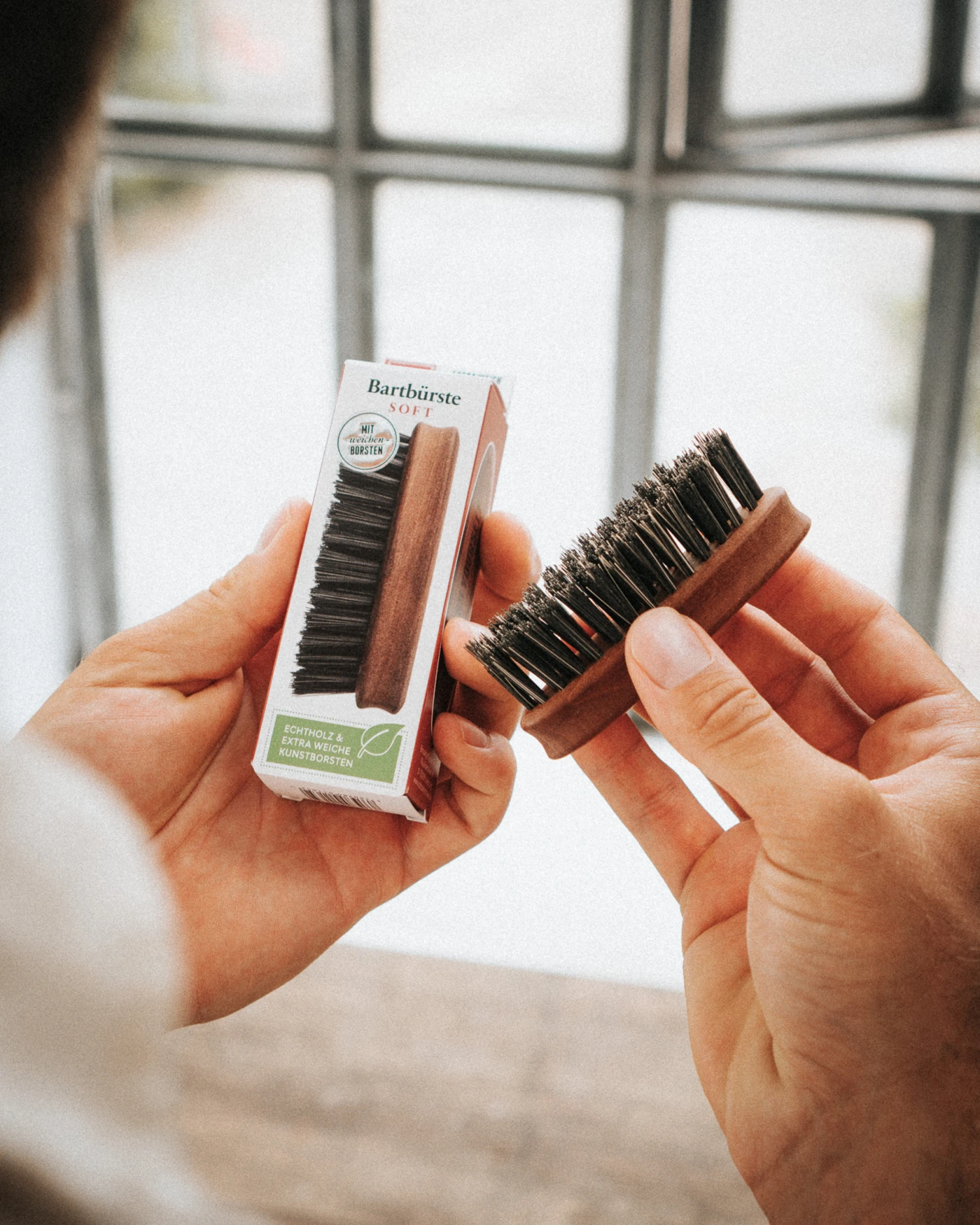 Bürste von oben nach unten über deinen trockenen oder nassen Bart. Nimmst du dazu etwas Bartöl, fühlt er sich noch weicher, glatter und besser an.