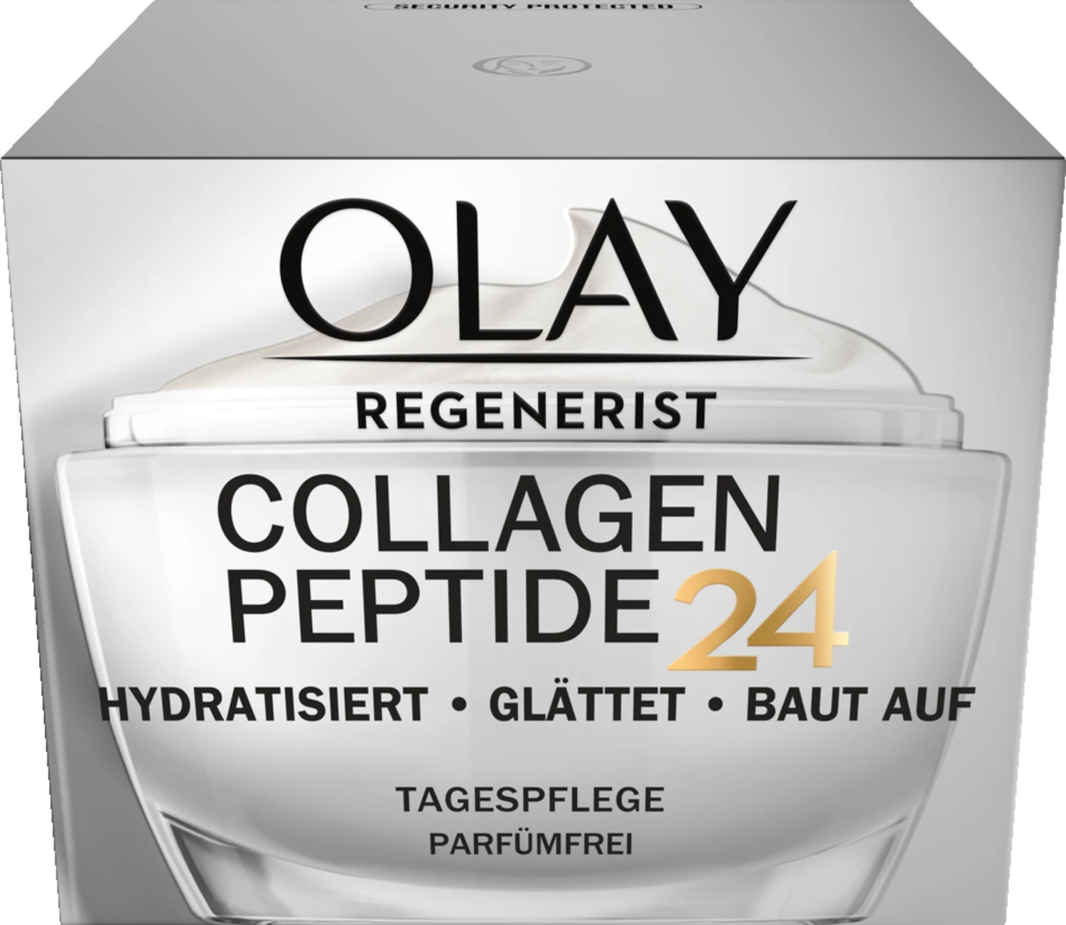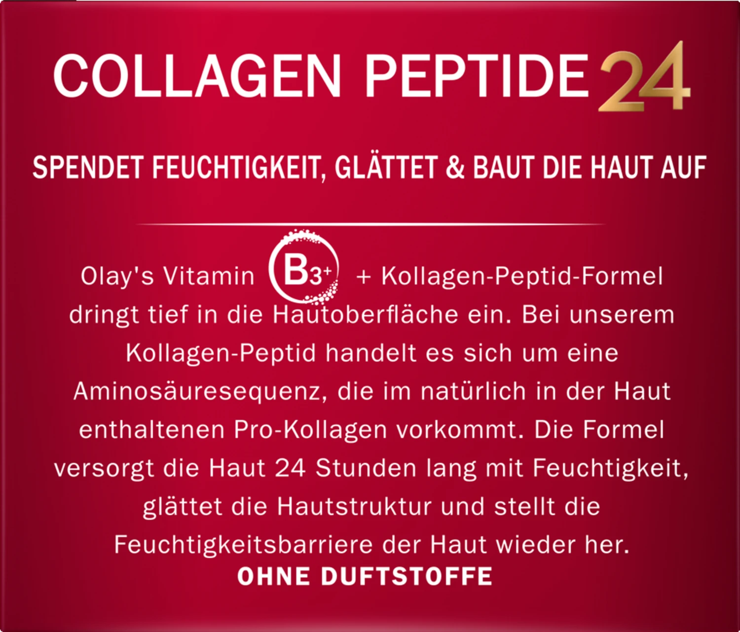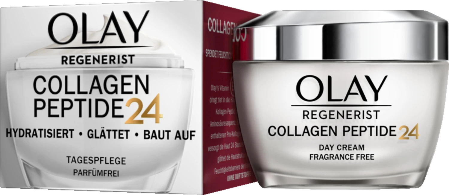Sichtbar starke und strahlende Haut in 14 Tagen mit der Olay Collagen Peptide24 Tagescreme. Wussten Sie, dass Kollagen ein wesentlicher Bestandteil der Haut ist? Mit zunehmendem Alter – etwa ab den Dreißigern – nimmt die Menge an Kollagen in der Haut ab, wodurch die Haut Anzeichen für Ermüdungserscheinungen aufweist. Die Tagescreme von Olay wird mit Kollagen-Peptiden angereichert, die im Gegensatz zu Kollagenmolekülen bis zu 10 Schichten tief in die Hautoberfläche eindringen können. Zusammen mit Vitamin B3 wirkt die Formel schnell und spendet Ihrer Haut 24 Stunden lang intensive Feuchtigkeit. Außerdem hilft sie im Lauf der Zeit dabei, die Hautstruktur zu glätten und ihre Schutzbarriere wiederherzustellen – für eine starke und strahlende Haut. Die leichte Collagen Peptide24 Tagescreme ist parfümfrei und frei von Farbstoffen. Verwenden Sie die Olay Collagen Peptide24 Tagescreme 28 Tage lang und sehen Sie, wie sich Ihre Haut verwandelt. Die Olay Collagen Peptide24 Tagescreme ist für die tägliche Anwendung geeignet.