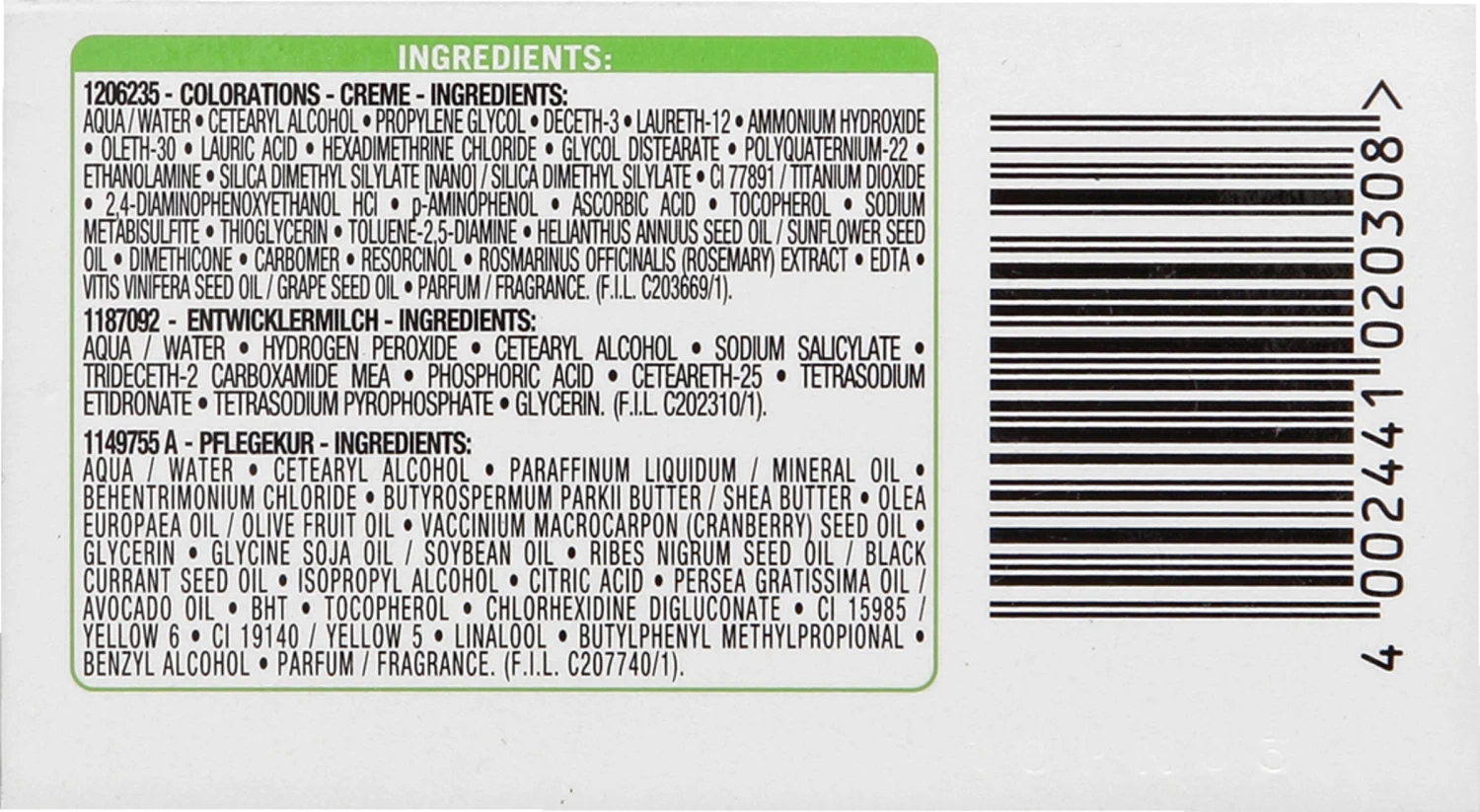 Colorationscreme: „AQUA / WATER • CETEARYL ALCOHOL • PROPYLENE GLYCOL • DECETH-3 • LAURETH-12 • AMMONIUMHYDROXIDE • OLETH-30 • LAURIC ACID • HEXADIMETHRINE CHLORIDE • GLYCOL DISTEARATE •POLYQUATERNIUM-22 • ETHANOLAMINE • SILICA DIMETHYL SILYLATE [NANO] / SILICA DIMETHYL SILYLATE• CI 77891 / TITANIUM DIOXIDE • 2,4-DIAMINOPHENOXYETHANOL HCL • p-AMINOPHENOL • RIBES NIGRUMSEED OIL / BLACK CURRANT SEED OIL • ASCORBIC ACID • TOCOPHEROL • SODIUM METABISULFITE • OLEAEUROPAEA FRUIT OIL / OLIVE FRUIT OIL • THIOGLYCERIN • TOLUENE-2,5-DIAMINE • HELIANTHUS ANNUUSSEED OIL / SUNFLOWER SEED OIL • DIMETHICONE • CARBOMER • PERSEA GRATISSIMA OIL / AVOCADO OIL• RESORCINOL • ROSMARINUS OFFICINALIS EXTRACT / ROSEMARY EXTRACT • EDTA • VITIS VINIFERA SEEDOIL / GRAPE SEED OIL • GLYCINE SOJA OIL / SOYBEAN OIL • PARFUM / FRAGRANCE. „Entwicklermilch oder -creme: „AQUA / WATER • HYDROGEN PEROXIDE • CETEARYL ALCOHOL • SODIUM SALICYLATE • TRIDECETH-2CARBOXAMIDE MEA • PHOSPHORIC ACID • CETEARETH-25 • TETRASODIUM ETIDRONATE • TETRASODIUMPYROPHOSPHATE • GLYCERIN. „Pflegekur: „AQUA / WATER • CETEARYL ALCOHOL • DIMETHICONE • GLYCERIN • BEHENTRIMONIUM CHLORIDE • OLEA EUROPAEAFRUIT OIL / OLIVE FRUIT OIL • ARGANIA SPINOSA KERNEL OIL • VACCINIUM MACROCARPON (CRANBERRY) SEED OIL •HELIANTHUS ANNUUS SEED OIL / SUNFLOWER SEED OIL • ROSMARINUS OFFICINALIS LEAF EXTRACT / ROSEMARY LEAFEXTRACT • PERSEA GRATISSIMA OIL / AVOCADO OIL • BUTYROSPERMUM PARKII BUTTER / SHEA BUTTER •AMODIMETHICONE • ISOPROPYL ALCOHOL • CAPRYLYL GLYCOL • CITRIC ACID • LACTIC ACID • TOCOPHEROL • SODIUMBENZOATE • CETRIMONIUM CHLORIDE • LINALOOL • BENZYL ALCOHOL • PARFUM / FRAGRANCE. „