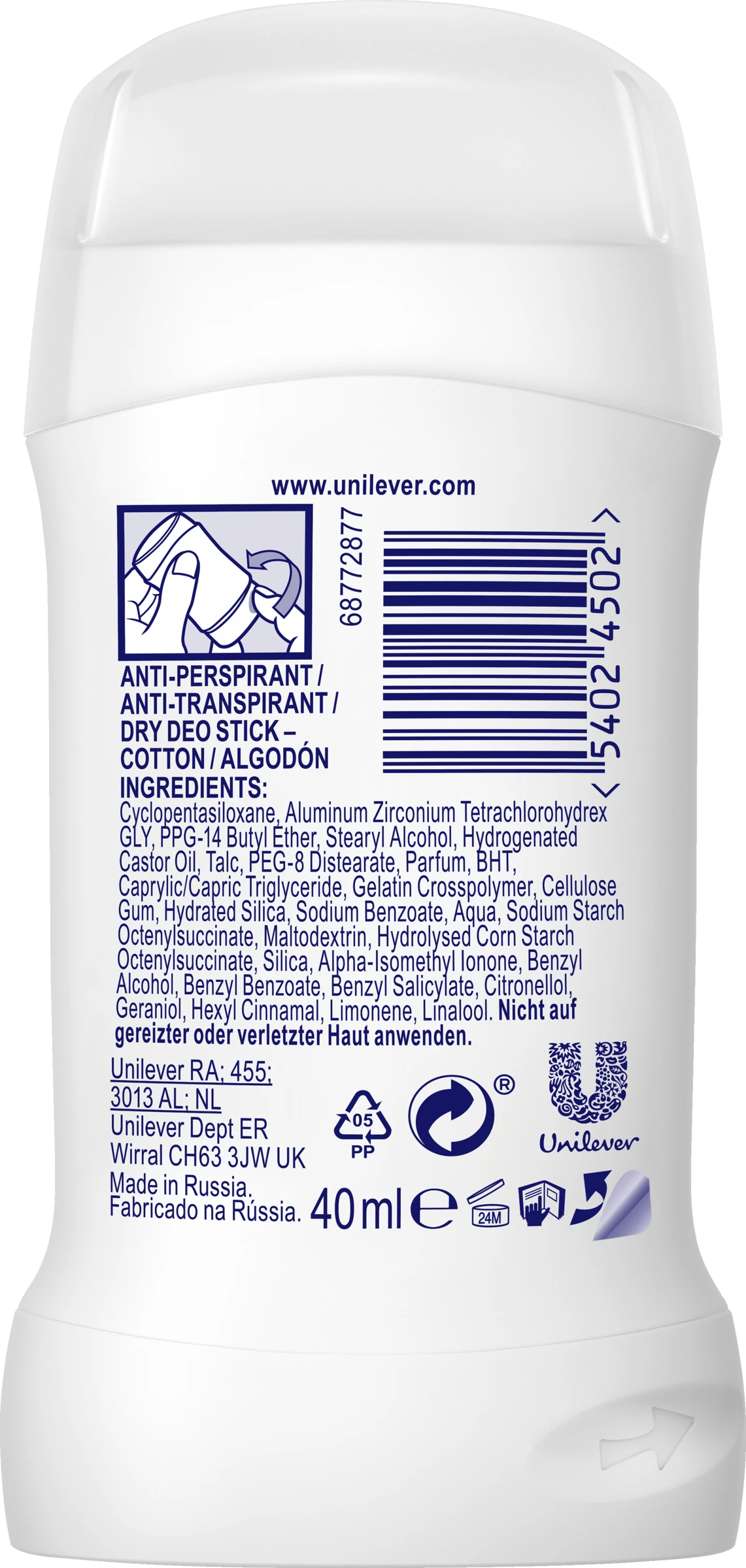 Das Anti-Transpirant Cotton Dry von Rexona, hat einen leicht blumigen und dezenten Duft, der von Baumwolle inspiriert wurde. Es bietet durch die Motionsense-Technologie 48 Stunden zuverlässigen Schutz vor Achselnässe und Körpergeruch. Somit fühlt man sich mit dem Rexona Deostick Cotton Dry trocken und frisch, egal wie viel man sich bewegt.