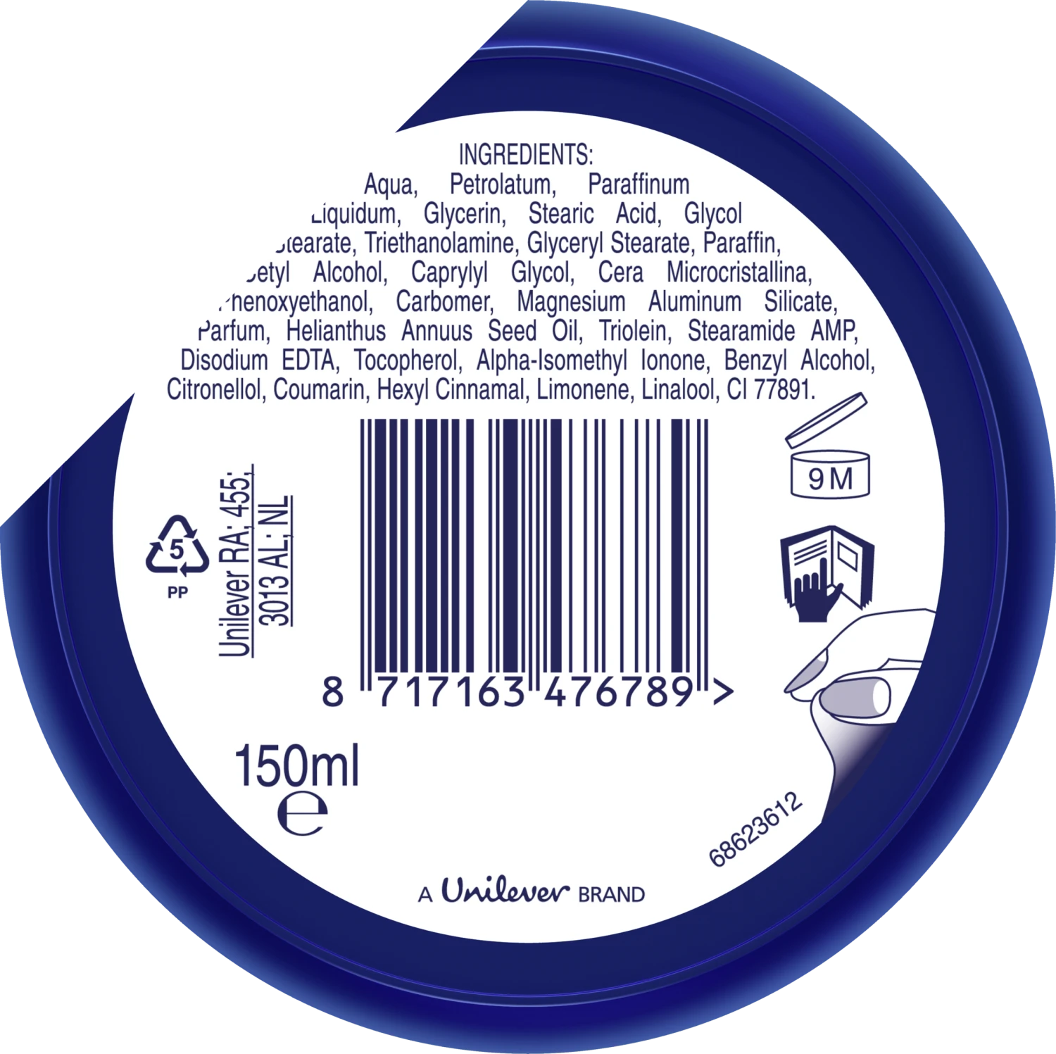 Aqua, Petrolatum, Paraffinum Liquidum, Glycerin, Stearic Acid, Glycol Stearate, Triethanolamine, Glyceryl Stearate, Paraffin, Cetyl Alcohol, Caprylyl Glycol, Cera Microcristallina, Phenoxyethanol, Carbomer, Magnesium Aluminium Silicate, Parfum, Helianthus Annuus Seed Oil, Triolein, Stearamide AMP, Disodium EDTA, Tocopherol, Alpha-Isomethyl Ionone, Benzyl Alcohol, Citronellol, Coumarin, Hexyl Cinnamal, Limonene, Linalool, CI 77891