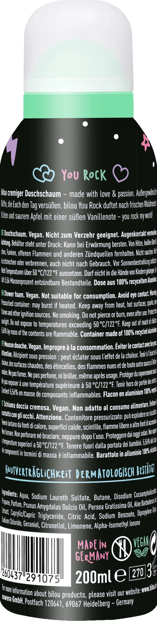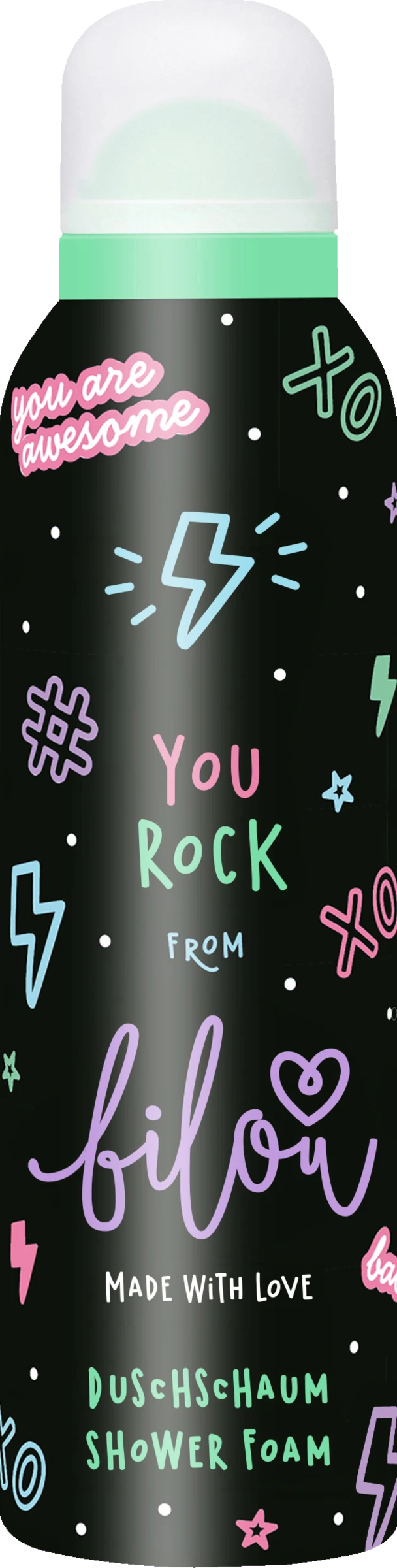 bilou cremiger Duschschaum – made with love & passion. Außergewöhnliche Düfte, die Euch den Tag versüßen. bilou You Rock duftet nach frischen Waldmeisterblüten und saurem Apfel mit einer süßen Vanillenote – you rpck my world!