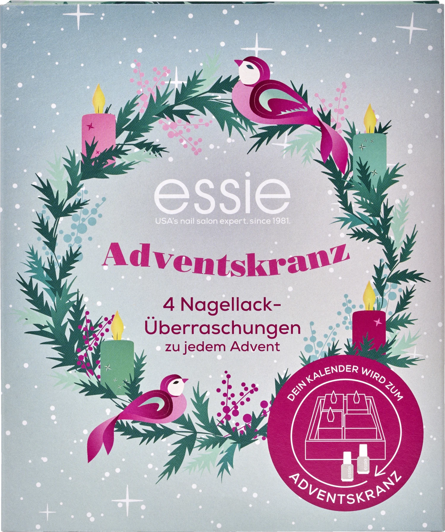 Der essie Mini Adventskalender 2022 ist der perfekte Begleiter in der Adventszeit. Er hält 4 Nagellack-Überraschungen für jeden Adventstag bereit und versüßt so die Weihnachtstage noch mehr. Der Mini Adventskalender bietet die Möglichkeit die wundervollen essie Nagellacke zu entdecken. Insgesamt beinhaltet der Adventskalender 4 Produkte in Originalgröße.