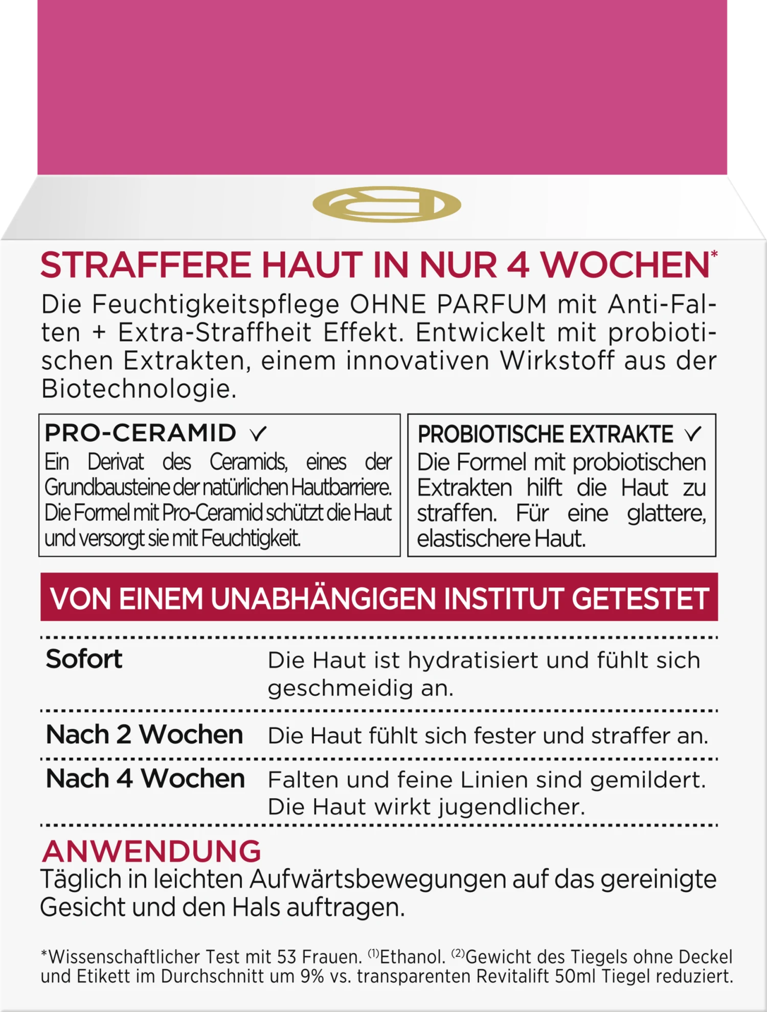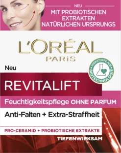 L’Oréal Paris Revitalift Klassik Feuchtigkeitspflege ohne Parfum mit straffenden Probiotika aus natürlichem Ursprung mildert Falten und strafft die Haut. Bereits nach der ersten Anwendung ist die Haut hydratisiert. Nach 4 Wochen sind Falten und feine Linien gemildert und die Haut wirkt jugendlicher.