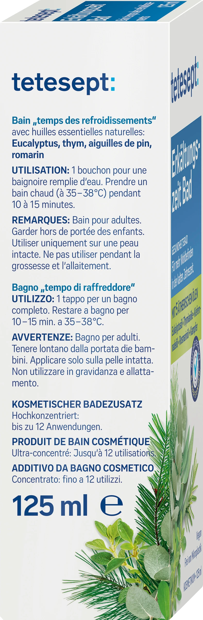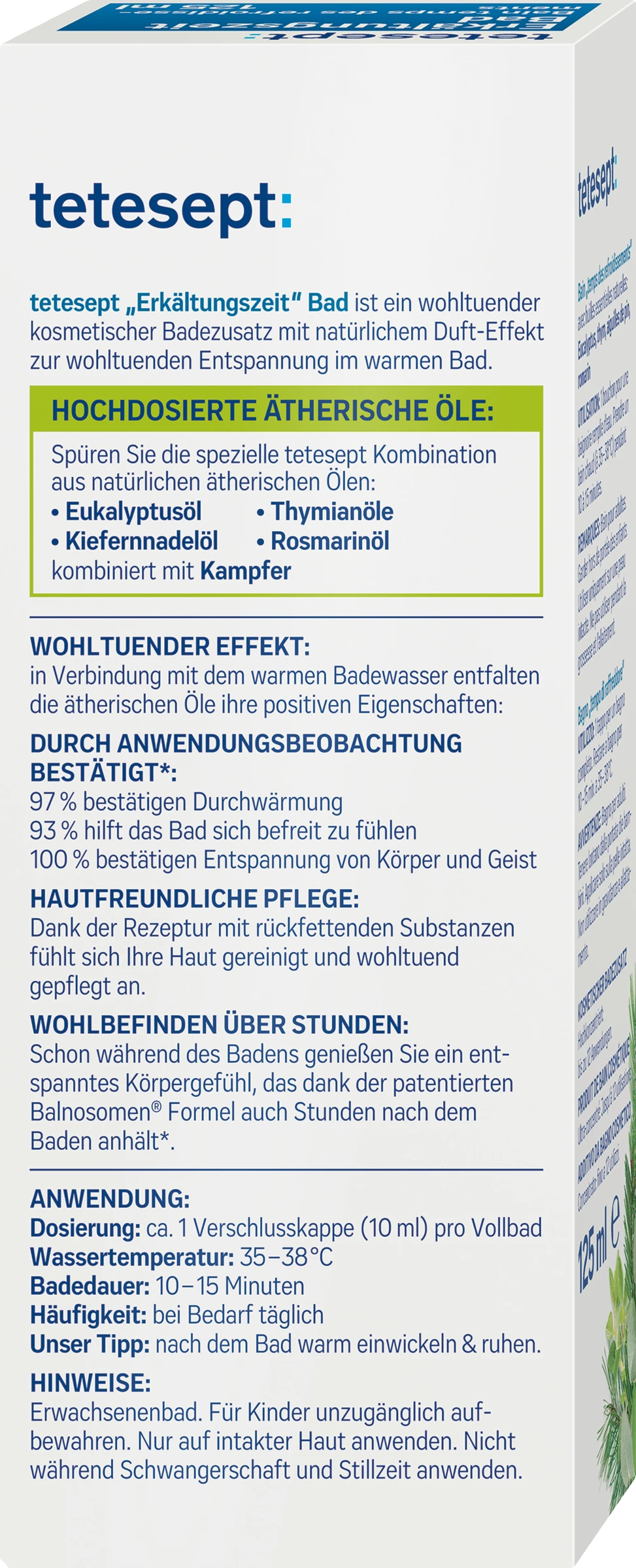 tetesept ,,Erkältungszeit“ Bad ist ein wohltuender kosmetischer Badezusatz mit natürlichem Duft-Effekt zur wohltuenden Entspannung im warmen Bad.
