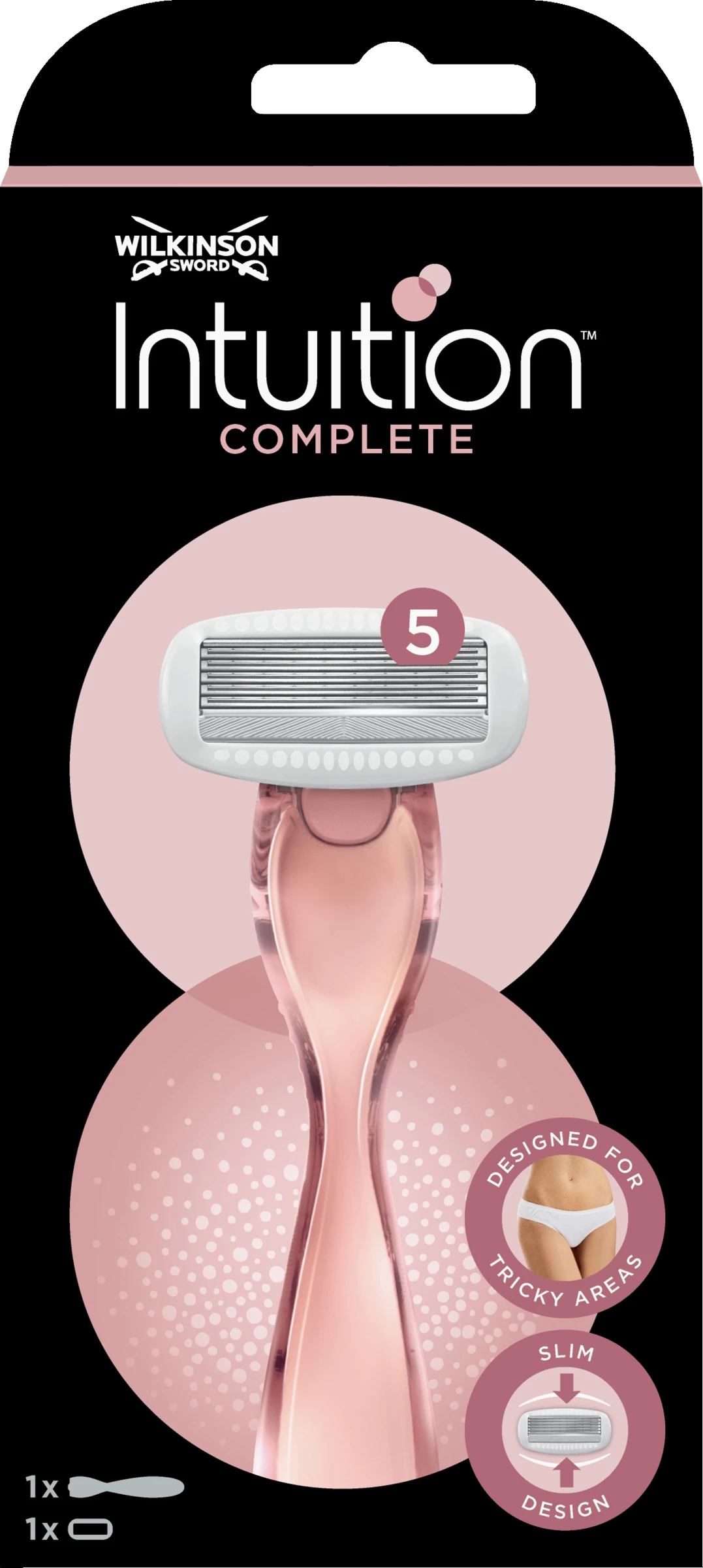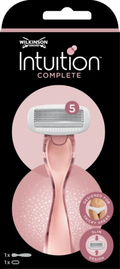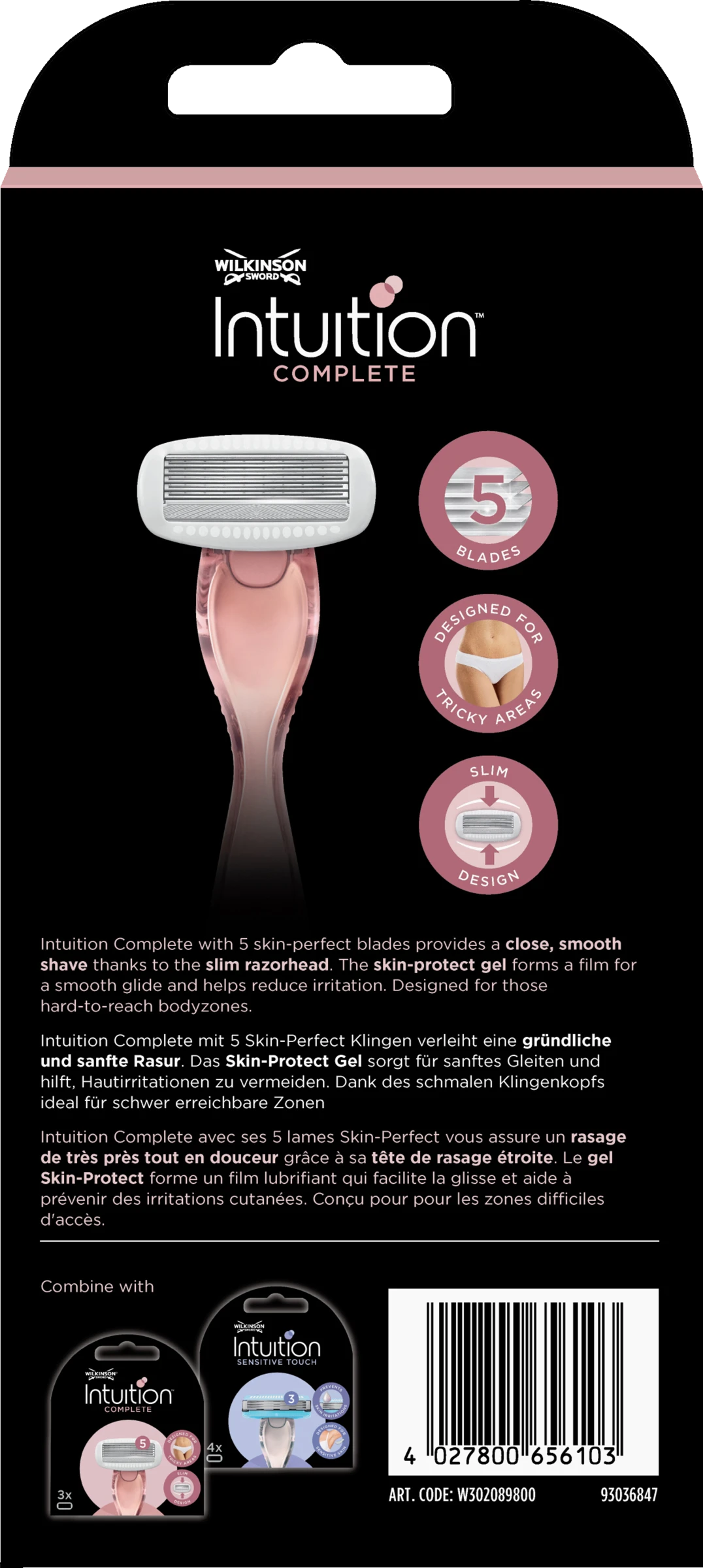 Intuition Complete mit 5 Skin-Perfect- Klingen verleiht eine gründliche, samtweiche Rasur – auch an schwer erreichbaren Stellen dank des schlanken Klingenkopfs. Das Skin-Protect-Gel sorgt für sanftes Gleiten und hilft, Hautirritationen zu vermeiden.