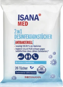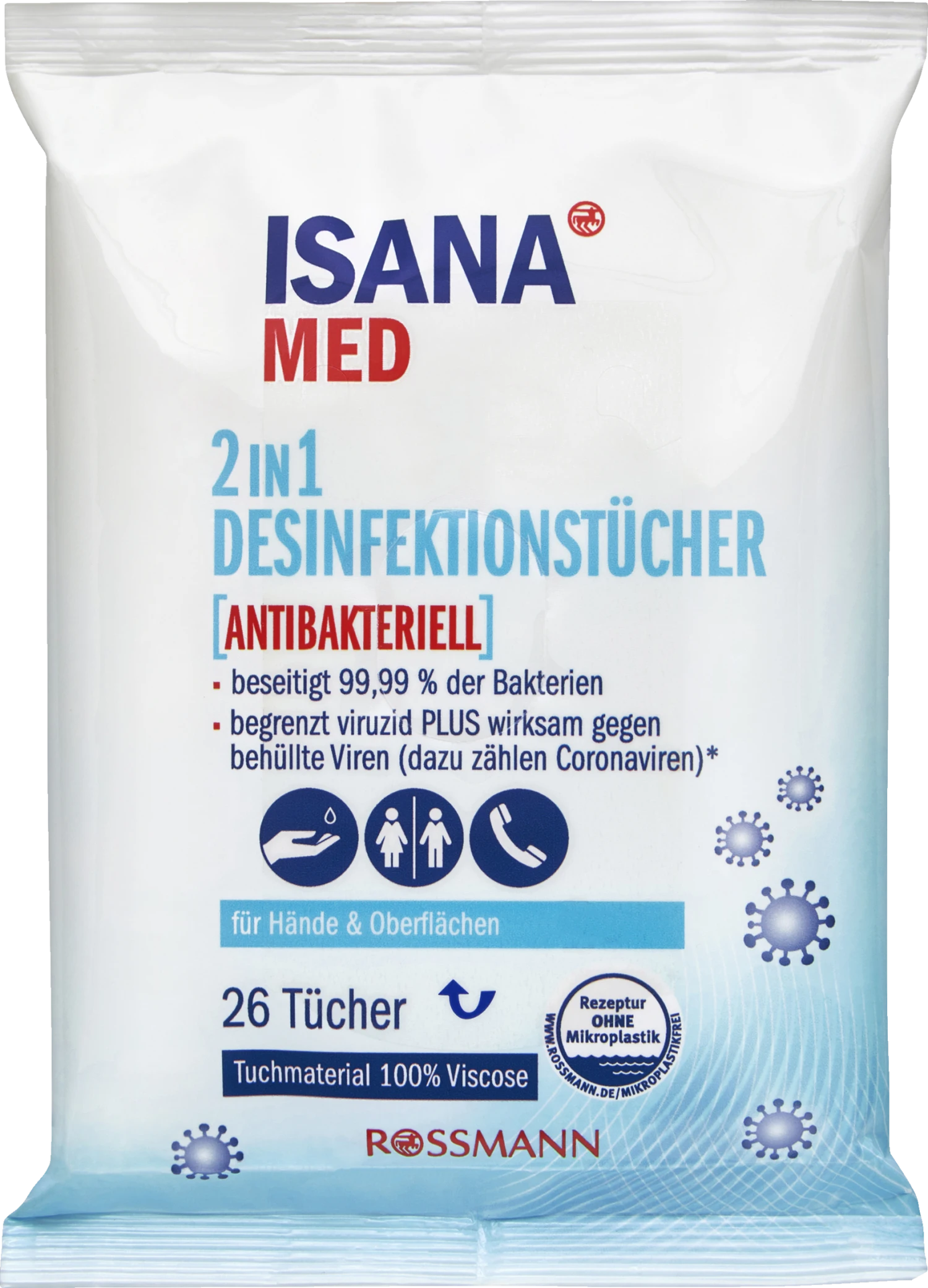 ISANA Med 2in1 Desinfektionstücher- antibakteriell- beseitigt 99,99% der Bakterien- begrenzt viruzid PLUS wirksam gegen behüllte Viren (dazu zählen Coronaviren)- für Hände & OberflächenAnwendung: Zur Händedesinfektion: Mit einem Tuch ca. 60 Sek. lang die Hände gründlich benetzen. Die Hände müssen während der gesamten Applikationszeit durch das Präparat feucht gehalten werden.Zur Flächendesinfektion: Flächen und Gegenstände vollständig benetzen und 30 Sekunden einwirken lassen. Die Fläche trocknet nach kurzer Zeit rückstandsfrei ab.Diese Rezeptur ist zu 100% ohne Mikroplastik.