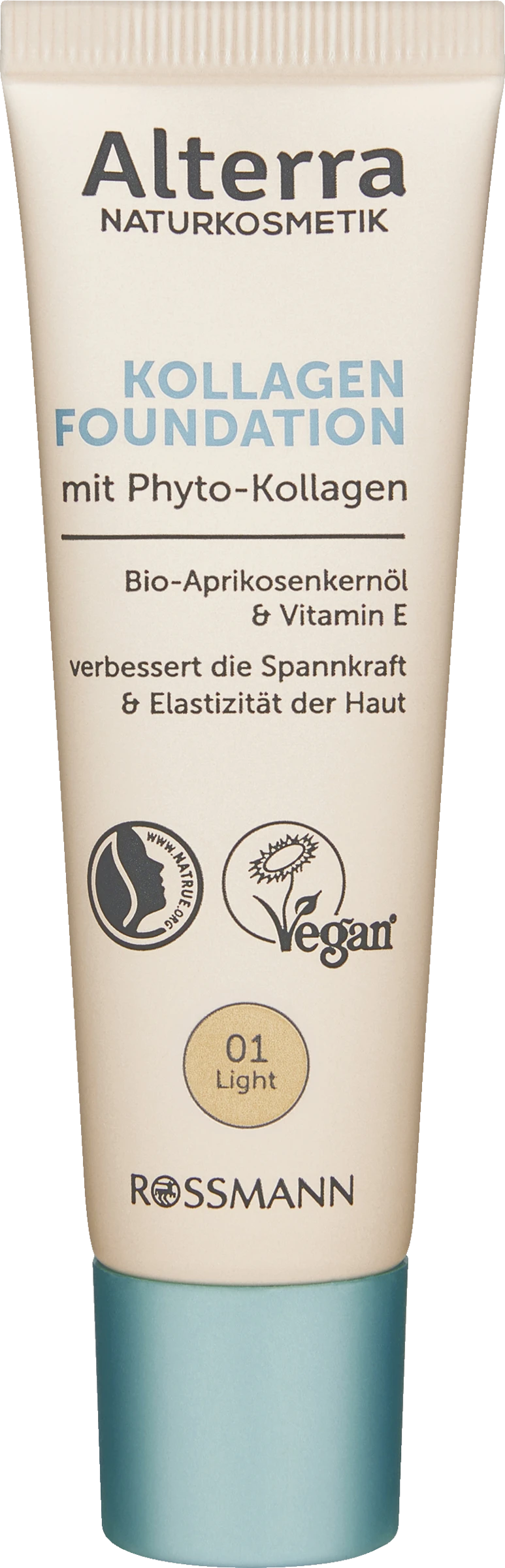 Durch die Pflegeformel mit Bio-Aprikosenkernöl, Vitamin E und hochwertigem Phyto-Kollagen, einer pflanzlichen Alternative zu Kollagen, sorgt die Foundation für optisch gemilderte Fältchen und wirkt den Zeichen der Hautalterung entgegen. Angereichert mit wertvollem Q10 verbessert sie die Spannkraft und Elastizität der Haut – für eine vitale und frische Ausstrahlung. Die leichte und cremige Formulierung sorgt mit mittlerer Deckkraft für ein glattes und natürliches Finish.Bei anspruchsvoller Haut vor der Anwendung Ihre gewohnte Alterra Gesichtspflege auftragen. Lassen Sie diese gut einziehen, bevor Sie die Foundation sanft auf der Haut verteilen.Tube* besteht aus 55% Recycling-Material (*Tube ohne Verschluss)Papier Faltschachtel aus verantwortungsvollen Quellen (FSC-Mix)Diese Rezeptur ist zu 100% ohne Mikroplastik laut zertifizierter Naturkosmetik.Das Alterra-Produkt entspricht den strengen Natrue-Kriterien.Hautverträglichkeit dermatologisch bestätigt.