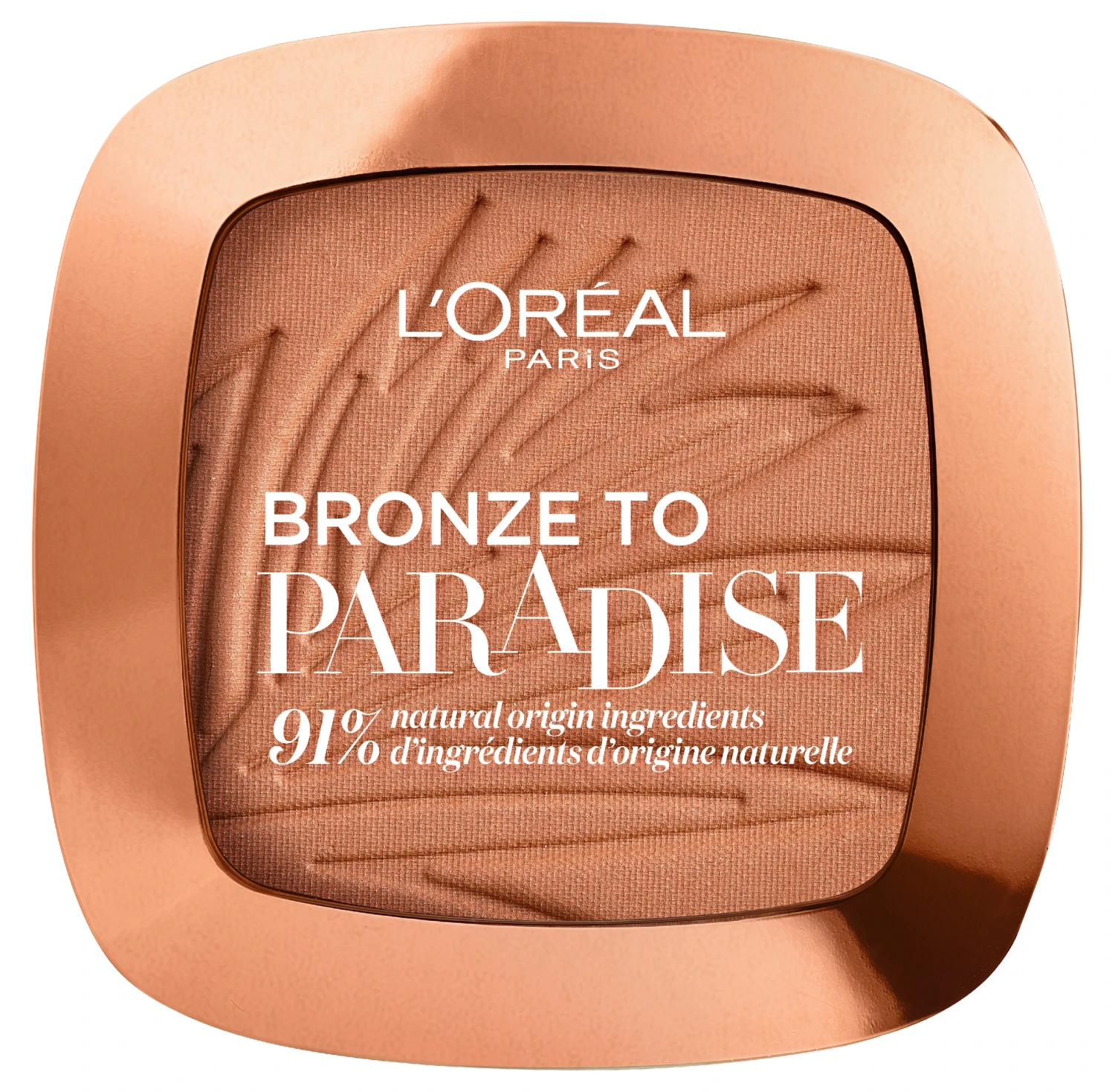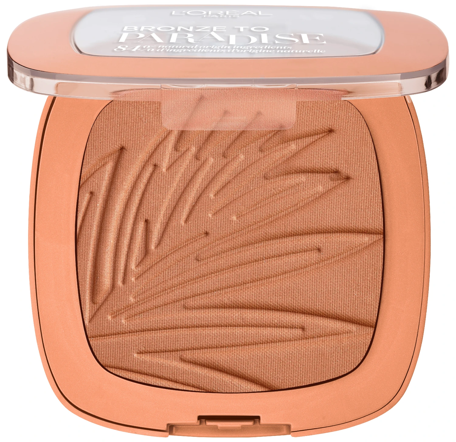 Take your Skin to Paradise: Der Bronze to Paradise Puder Bronzer von L’Oréal Paris ist die ideale Wahl für einen natürlich strahlenden, paradiesischen Look – wie von der Sonne geküsst! Schimmerpartikel verleihen Gesicht, Schultern und Dekolleté einen verführerischen, natürlich gebräunten, glowy Bronze-Look. Die seidig-zarte Textur mit 91% Inhaltsstoffen natürlichen Ursprungs wie Kokosöl und Mangobutter verschmilzt mit der Haut und ermöglicht ein leichtes Auftragen und Verblenden. Der Bronze to Paradise Puder Bronzer eignet sich auch perfekt für zielgerichtetes Konturieren.