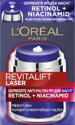 Die Revitalift Laser Gepresste Anti-Falten Pflege Nacht mit Retinol + Niacinamid von L’Oréal Paris mildert sichtbar Falten und korrigiert zugleich ein unebenmäßiges Hautbild. Dank enthaltenem Retinol [Vitamin A], ein von Dermatologen empfohlener Wirkstoff, wird den sichtbaren Anzeichen der Hautalterung effektiv entgegengewirkt. Niacinamid ist ein essenzieller Wirkstoff, der die Haut pflegt und durch seine aufhellenden Eigenschaften für einen gleichmäßigen Hautton sorgt. Die innovative Press-Tiegel-Technologie sorgt für eine hygienische Anwendung und leichte Dosierung. Nach einer Nacht fühlt sich die Haut intensiv mit Feuchtigkeit versorgt und genährt an. Nach 14 Nächten werden Falten sichtbar gemildert. Der Teint ist ebenmäßiger. Die Haut am Hals ist straffer. In 4 Wochen verbessern sich die Faltenmilderung und die Ebenmäßigkeit des Hauttons weiter. Die Haut ist glatter und strahlender.