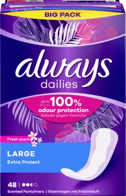 Mit Always Dailies Large Fresh Extra Protect Slipeinlagen fühlst Du dich den ganzen Tag lang angenehm frisch. Large Fresh Slipeinlagen sind extralang für zusätzlichen Schutz für Frische, auf die Du dich verlassen kannst. Dank der geruchsneutralisierenden Technologie und des saugfähigen Kerns sind sie ideal für die tägliche Frische, als zusätzlicher Schutz bei unregelmäßiger Periode oder leichtem Ausfluss.