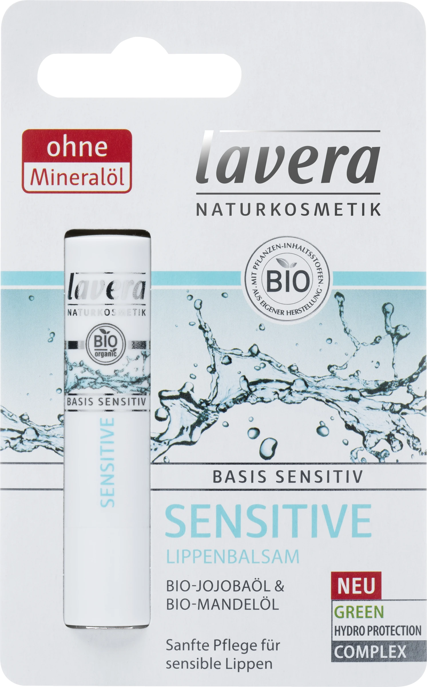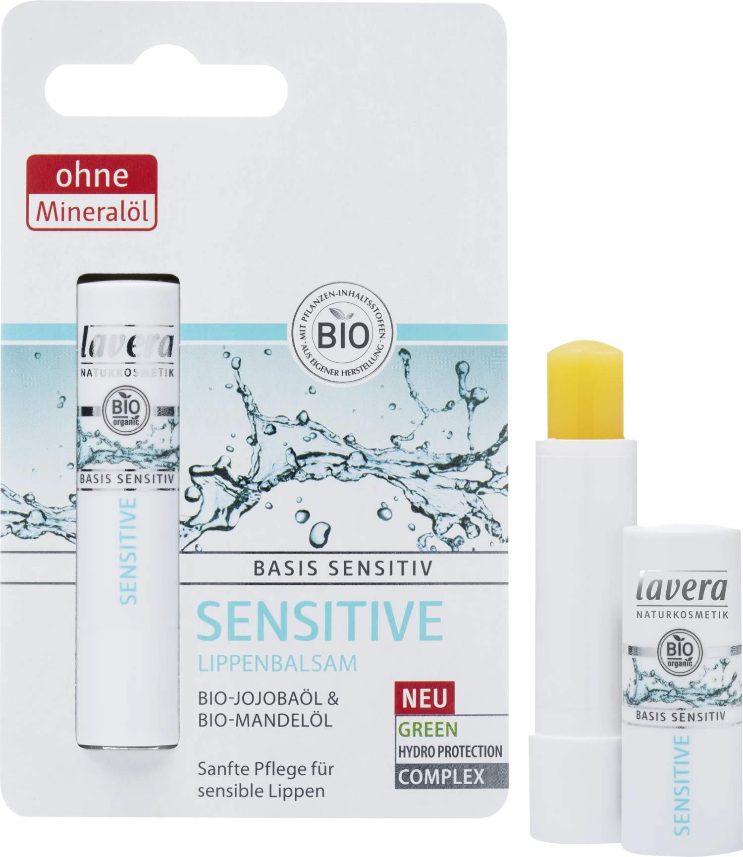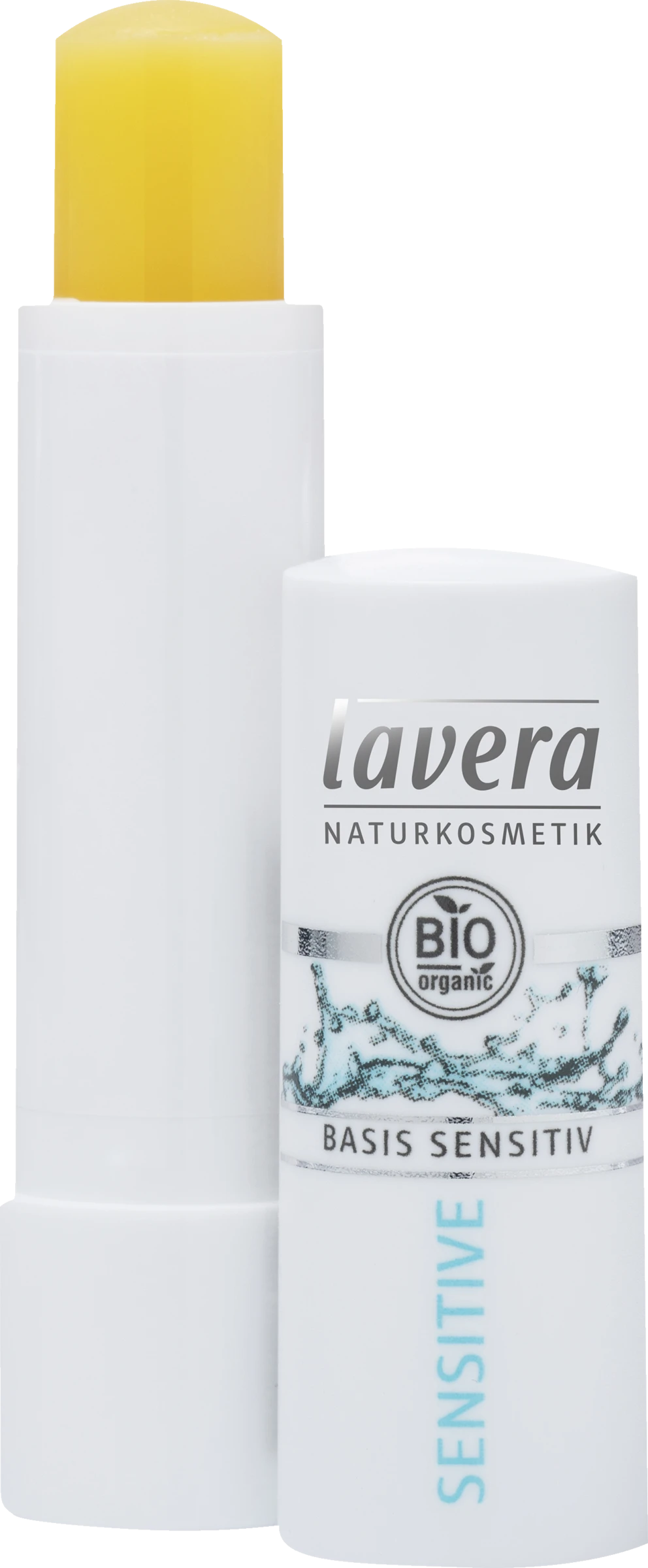 Der lavera Sensitive Lippenbalsam mit Bio-Jojobaöl und Bio-Mandelöl pflegt trockene und sensible Lippen.