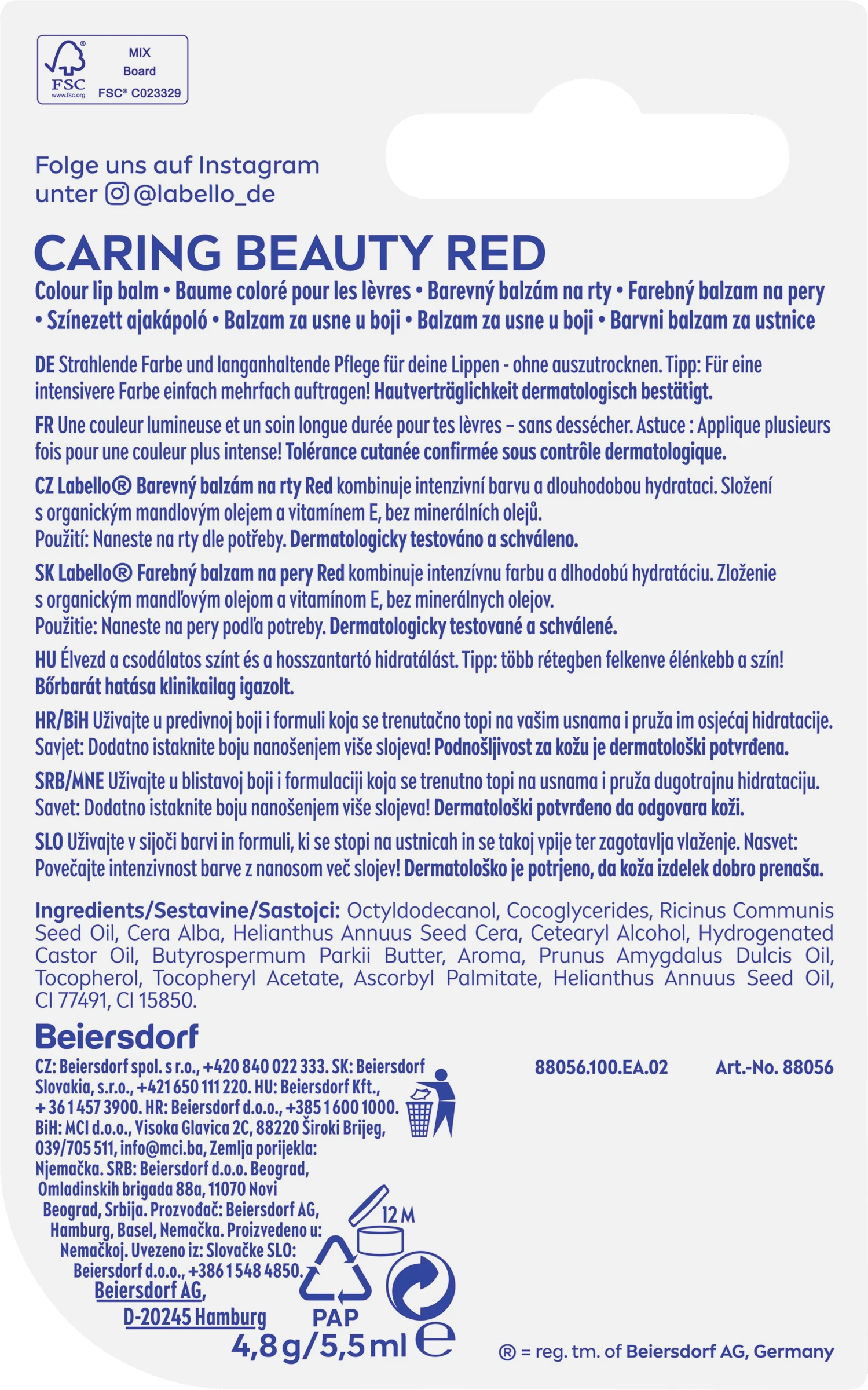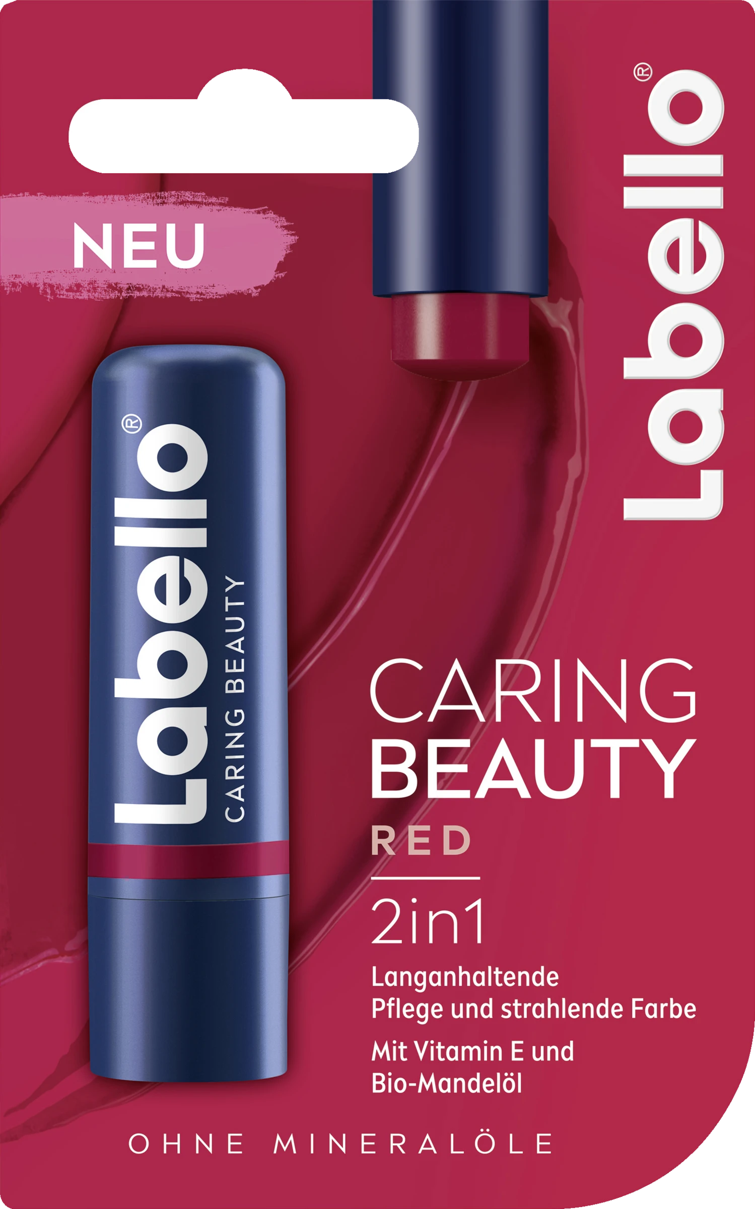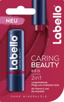 Labello Caring Beauty Red kombiniert Farbpigmente mit der bewährten Pflege von Labello. Die mineralölfreie Formel mit Sheabutter, Bio-Mandelöl, Vitamin E und einem leicht blumigen Duft wurde speziell für den täglichen Gebrauch entwickelt. Die Formel hinterlässt ein strahlendes Finish ohne auszutrocknen, pflegt langanhaltend und ist einfach gleichmäßig aufzutragen! Hautverträglichkeit dermatologisch bestätigt.