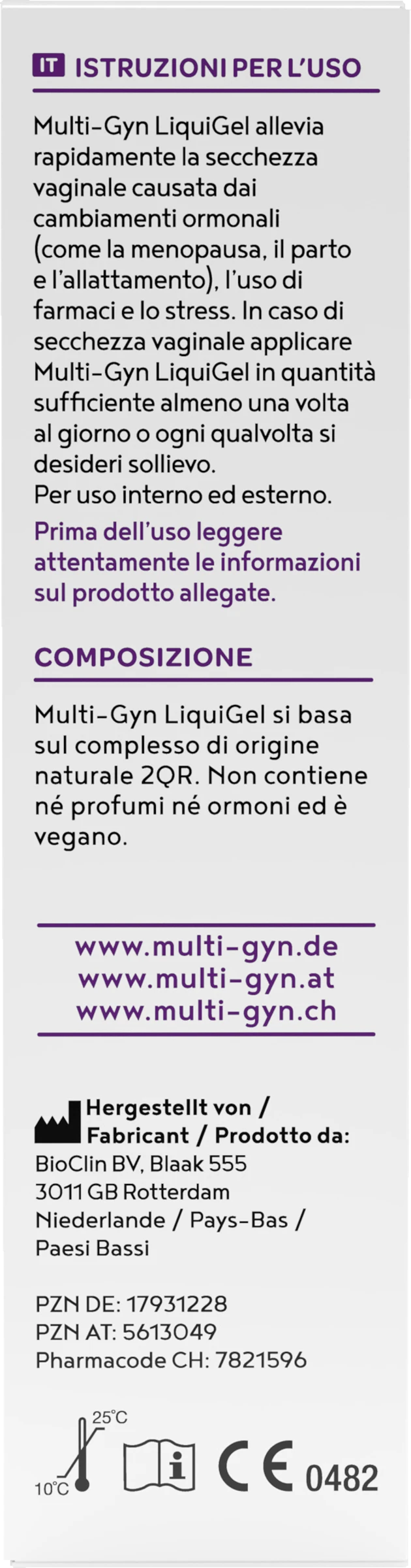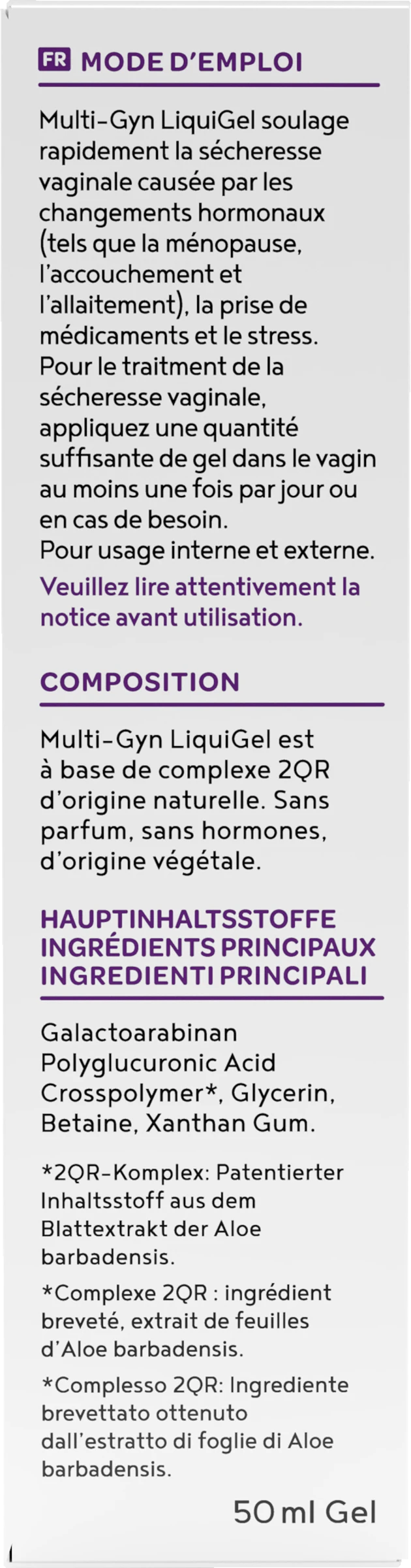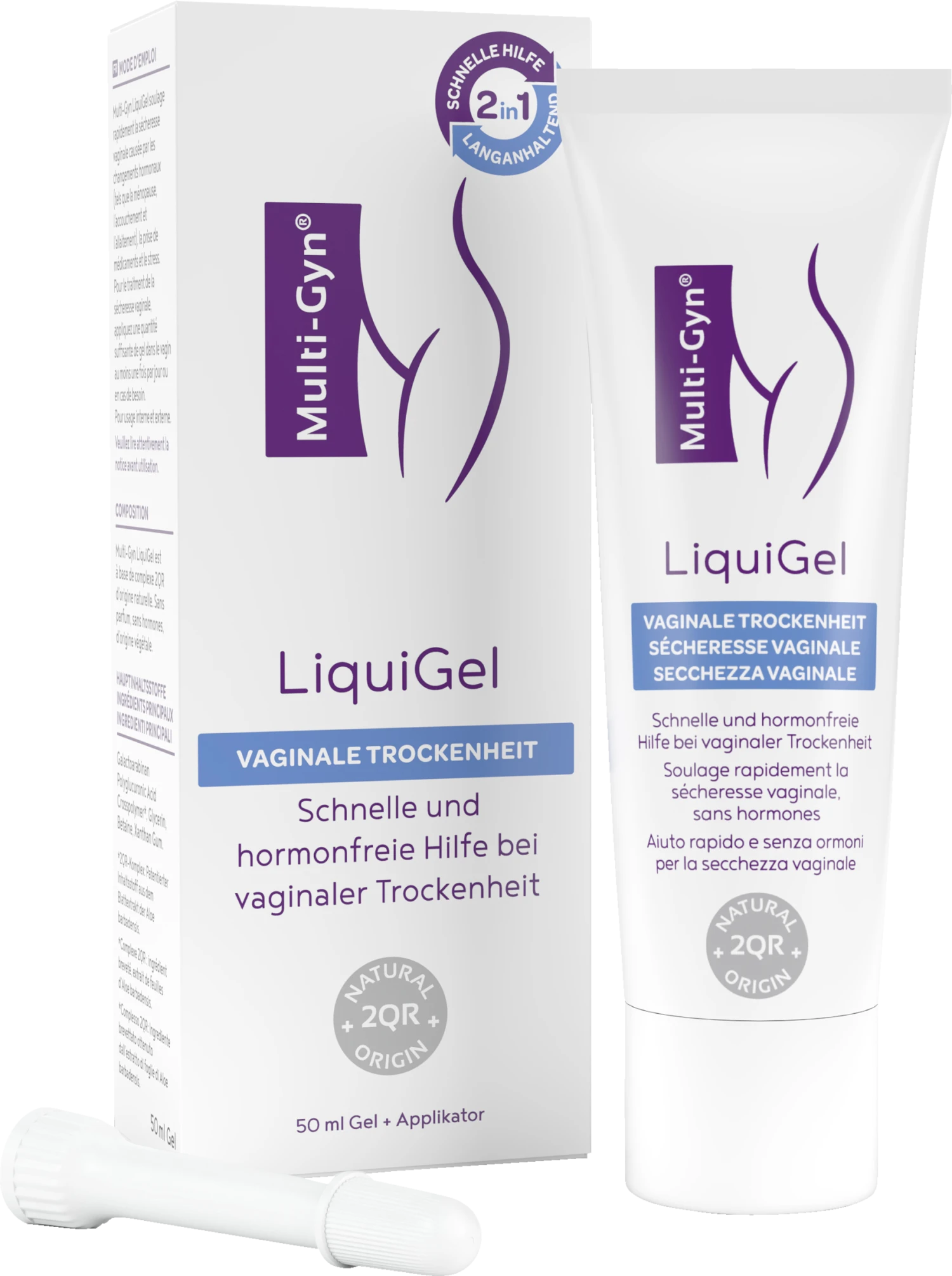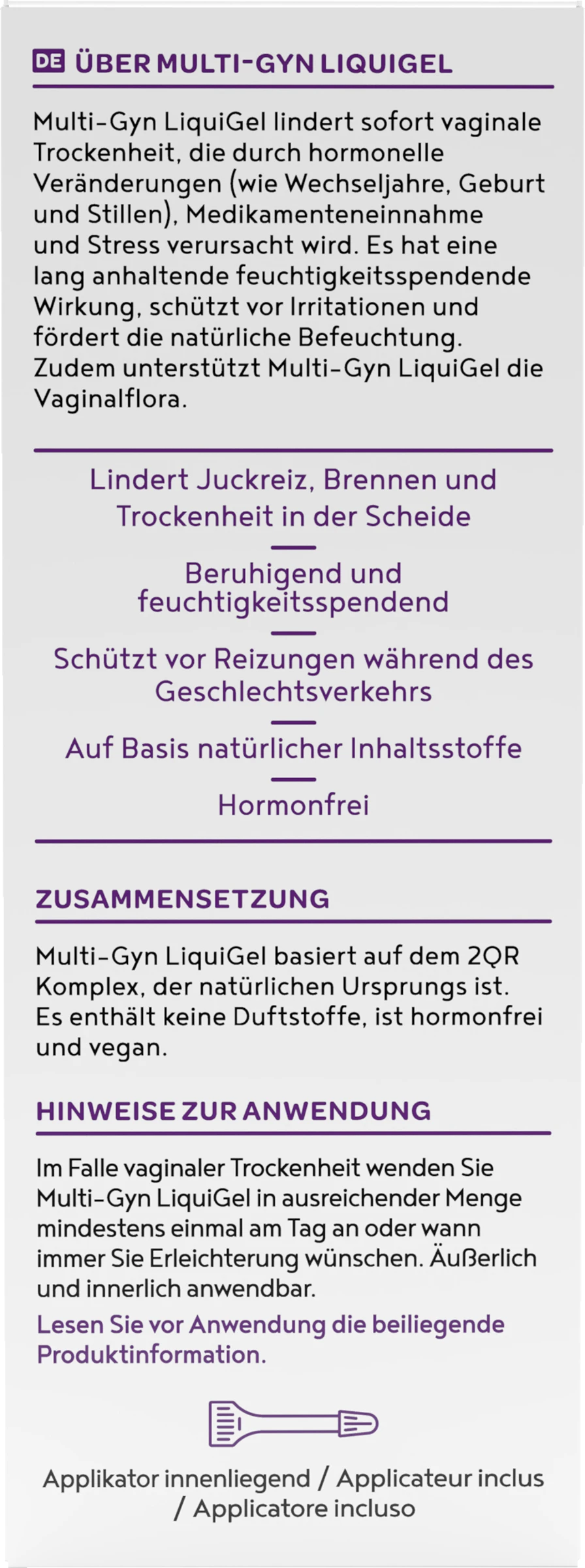 Multi-Gyn LiquiGel lindert sofort vaginale Trockenheit, die durch hormonelle Veränderung (wie Wechseljahre, Geburt und Stillen), Medikamenteneinnahme und Stress verursacht wird. Es hat eine lang anhaltende feuchtigkeitsspendende Wirkung, schützt vor Irritationen und fördert die natrürliche Befeuchtung.