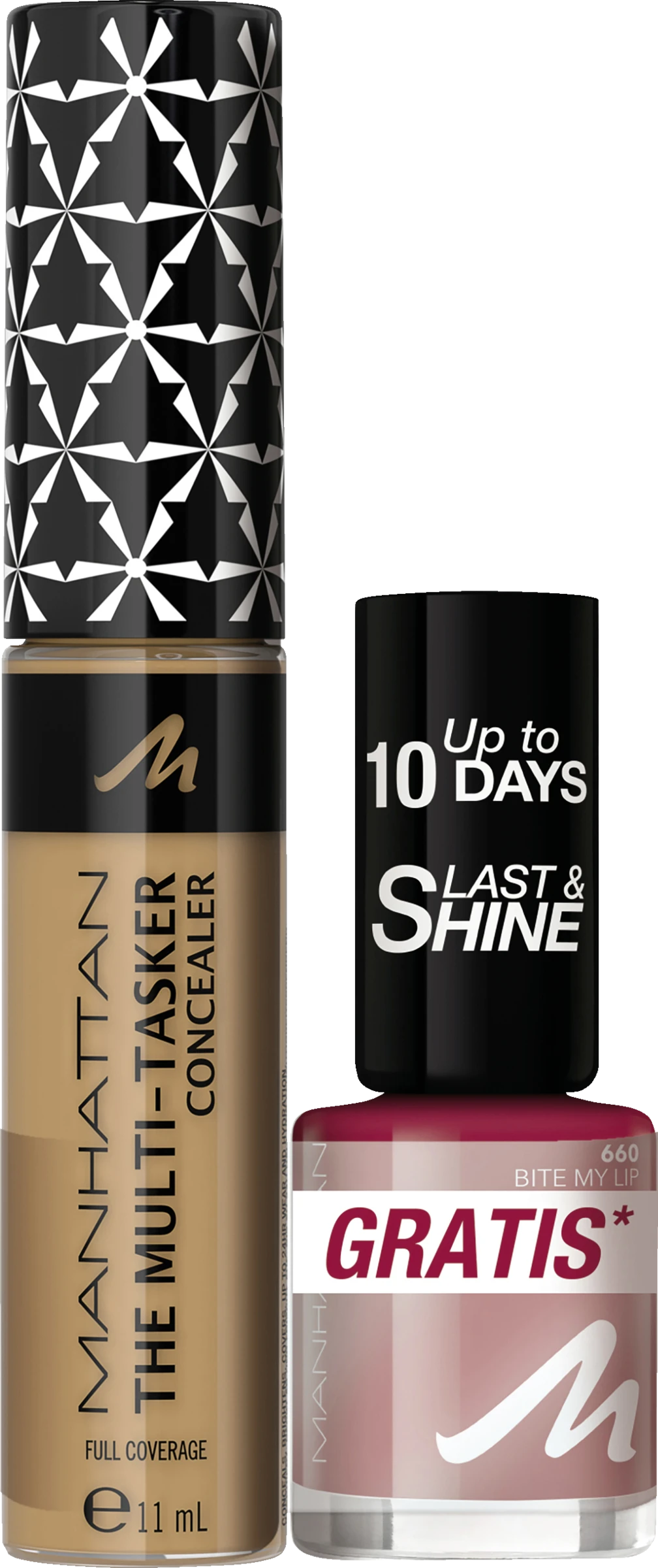 Das Set für einen strahlenden Auftritt: Der Manhattan Multi-Tasker Concealer Fb. 80 Tan zaubert einen perfekten Teint; der langanhaltende Last & Shine Nail Polish Fb. 660 Bite My Lip überzeugt mit brillanter Farbe und Pflege in einem. Der flüssige Concealer deckt Hautunreinheiten ab, hellt Augenringe auf und gleicht den Hautton aus. Der XXL-Soft-Touch-Applikator mit integriertem Produktreservoir ermöglicht eine präzise oder großflächige Anwendung. Die aufbaubare, hochpigmentierte Make-up-Formel verschmilzt perfekt mit der Haut und verleiht ihr ein strahlendes, glattes und ebenmäßiges Aussehen. Die leichte, nicht fettende Formel spendet dabei bis zu 24 Stunden lang Feuchtigkeit. Wisch- und wasserfest sorgt der Manhattan Multi-Tasker Concealer für einen makellosen Teint – den ganzen Tag lang.Dank Lotusextrakt und der patentierten Formulierung mit Continuous-Release-Technology sorgt der Manhattan Set Last & Shine Nail Polish mit langer Farbbeständigkeit und intensivem Glanz für 10 Tage Wow-Effekt.