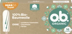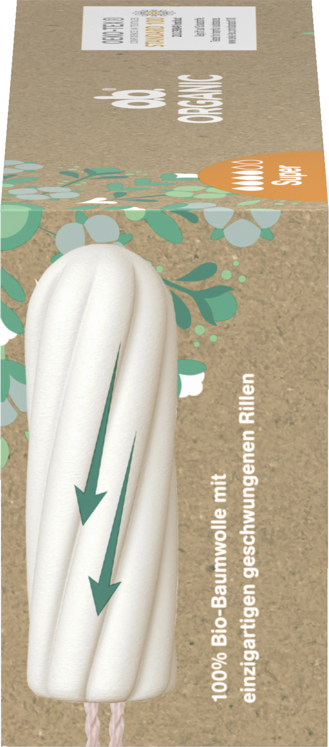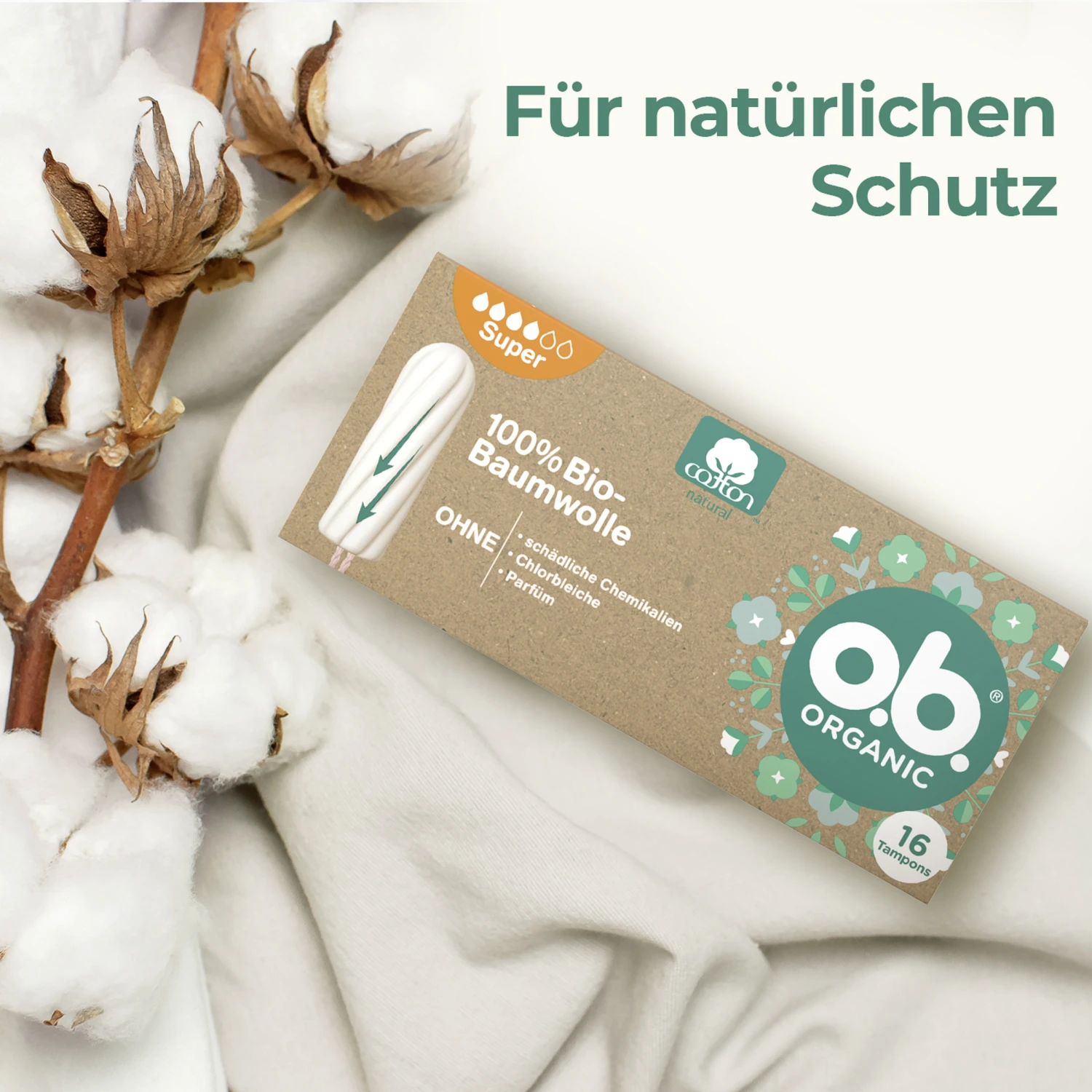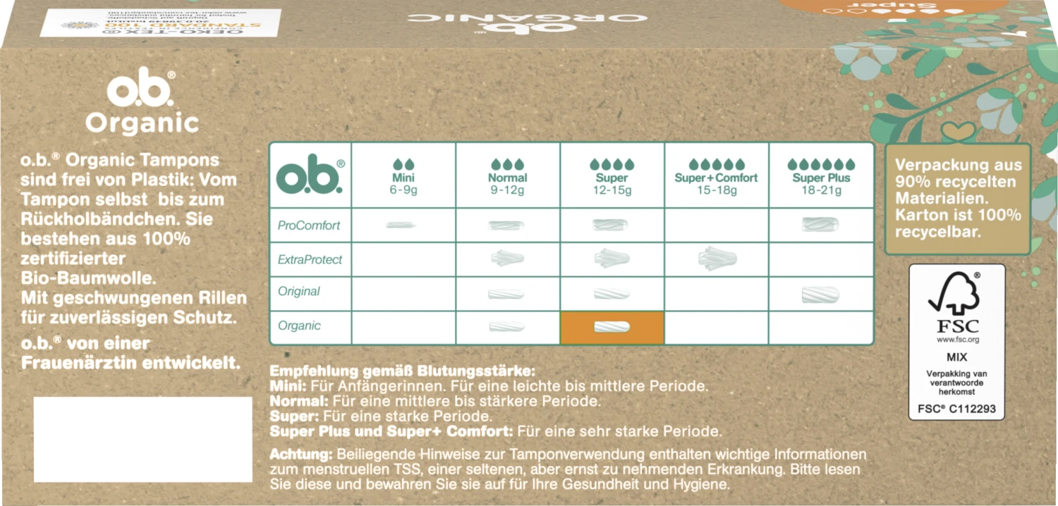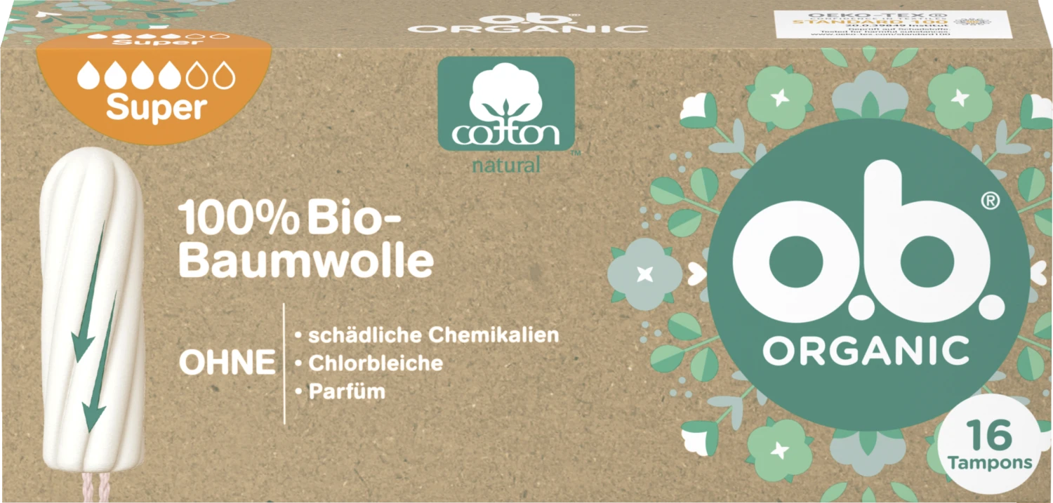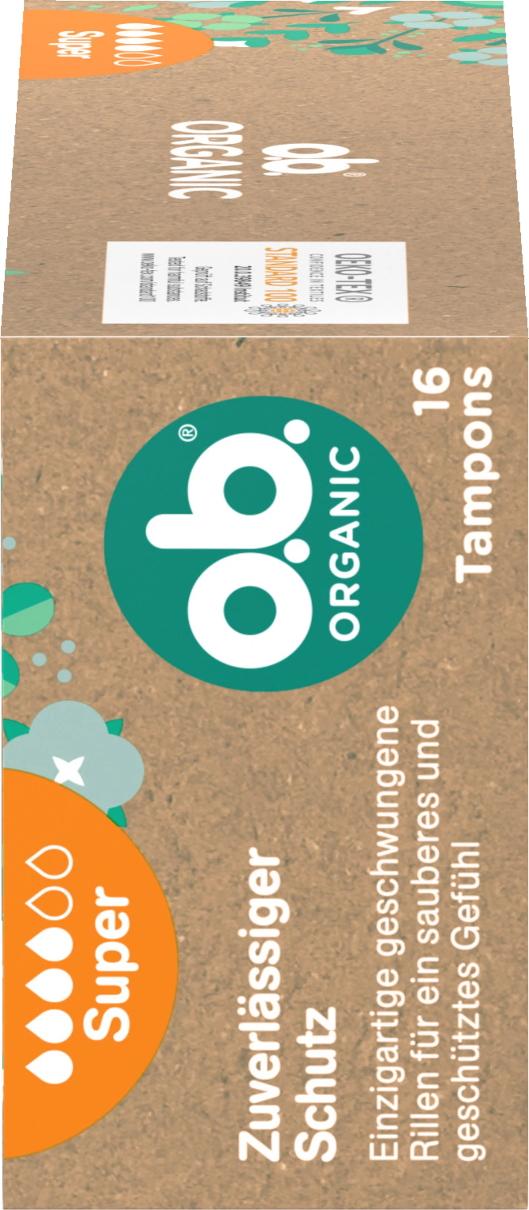 Die o.b.® Organic Super Tampons für starke Tage sind vom Tampon selbst bis zum Rückholbändchen frei von Plastik, für einen zuverlässigen und natürlichen Schutz. Die o.b.® Organic Super Tampons bestehen aus 100% zertifizierter Bio-Baumwolle und bieten mit ihren einzigartigen geschwungenen Rillen ein sauberes und geschütztes Gefühl. Darüber hinaus sind die Organic Tampons frei von schädlichen Chemikalien (z.B. Pestizide), Chlorbleiche und Parfüm. Zudem besteht die Verpackung zu 90% aus recycelten Materialien und der Karton ist zu 100% recycelbar. Außerdem sind sie zertifiziert von ECOCERT und produziert nach GOTS-Standard.