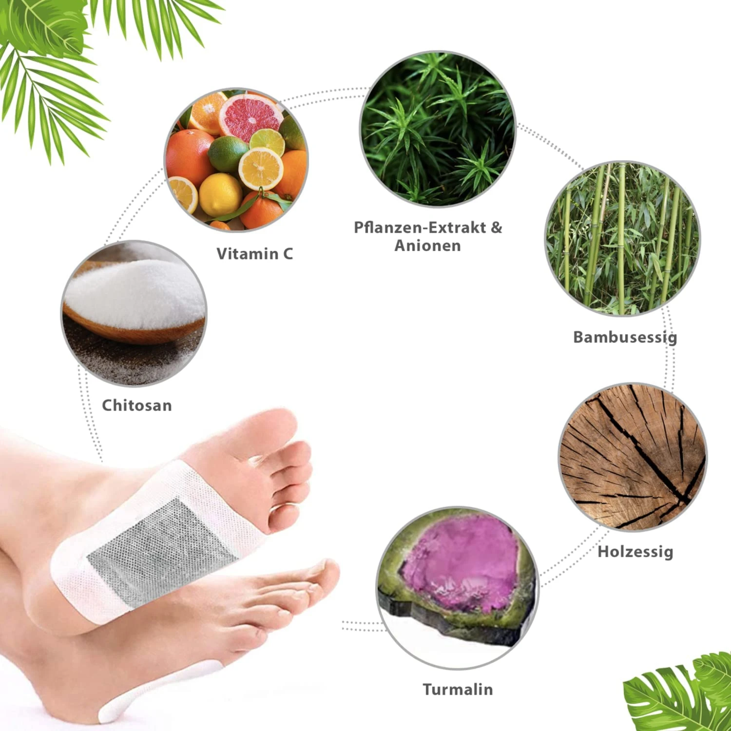 Die Fußpads mit Grünteeöl beinhalten natürliche Inhaltsstoffe, wie Bambusessig, Holzessig, Turmalin, Maisstärke, Chitin und Pflanzenfasern.