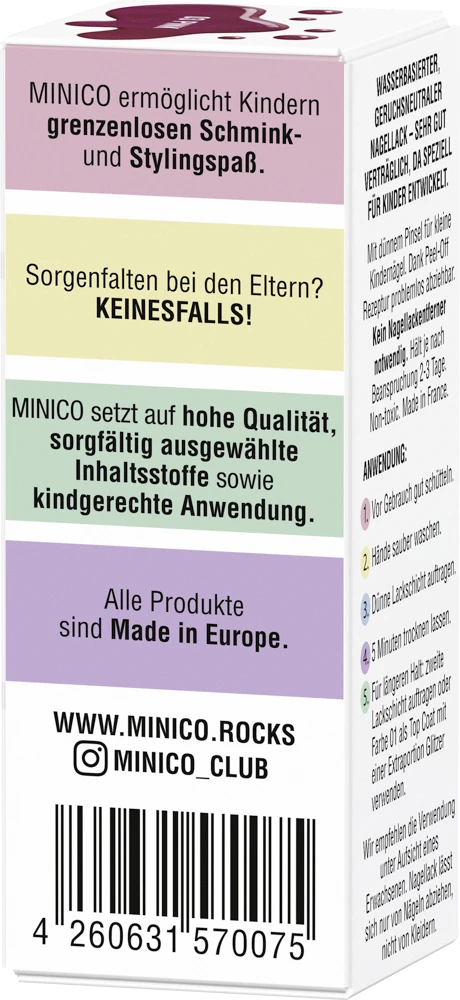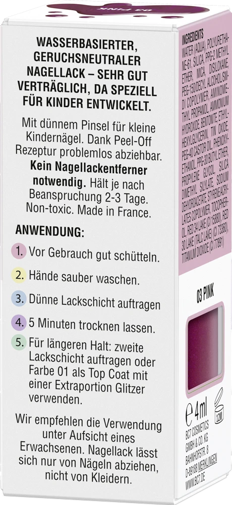 Wasserbasierter, abziehbarer Nagellack ohne Geruch – sehr gut verträglich, da speziell für Kinder entwickelt.