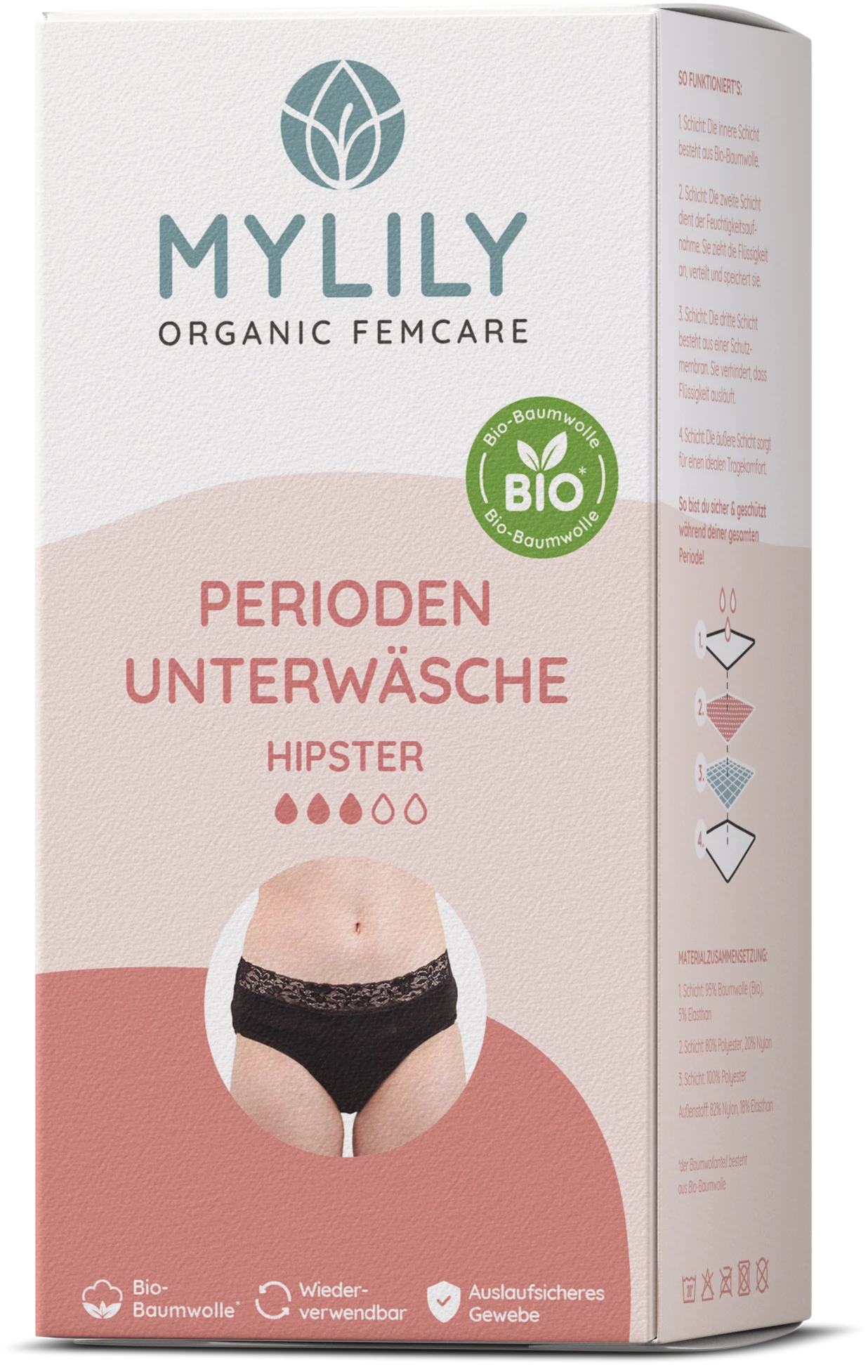 Der MYLILY Mensturationsslip im Hipster Schnitt besteht aus 4 verschiedenen Schichten. Die innere Schicht, die die Haut berührt, besteht aus Bio-Baumwolle, die gut für die tragende Person und die Umwelt ist! Die zweite Schicht ist eine Saugschicht, die Flüssigkeit anzieht, verteilt und speichert. Die dritte Schicht besteht aus einer Schutzmembran und sorgt dafür, dass nichts ausläuft. Und die äußerste Schicht besteht aus dem weichen schwarzen Bio-Baumwoll Stoff. Der MYLILY Hipster strong saugt bis zu 20 ml auf, das entspricht ca. 2-3 Tampons.