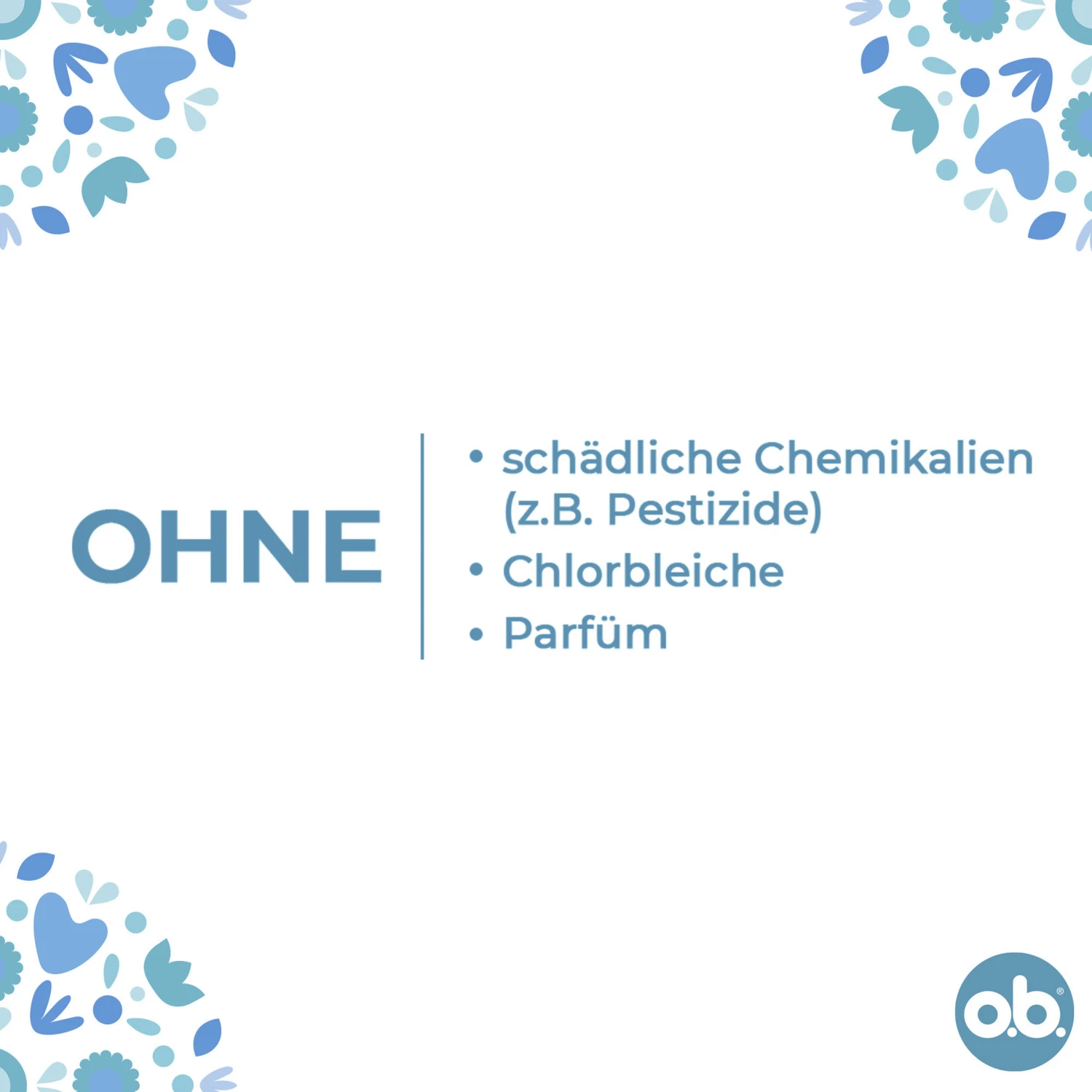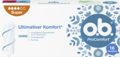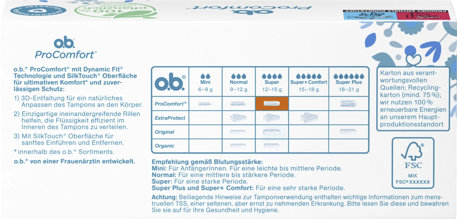 Die o.b.® ProComfort® Tampons mit Dynamic Fit™ Technologie und SilkTouch® Oberfläche sorgen für ultimativen Komfort* (*innerhalb des o.b.® Sortiments) und zuverlässigen Schutz: Die 3D Entfaltung sorgt für ein natürliches Anpassen des Tampons an den Körper und die einzigartigen und ineinander greifenden Rillen helfen die Flüssigkeit effizient im Inneren des Tampons zu verteilen. Die SilkTouch® Oberfläche sorgt für ein besonders sanftes Einführen und Entfernen. Zudem sind die o.b.® ProComfort® Tampons gynäkologisch getestet, enthalten einen 100% pflanzlich basierten Tamponkern und sind frei von schädlichen Chemikalien (z.B. Pestizide), Chlorbleiche und Parfüm.