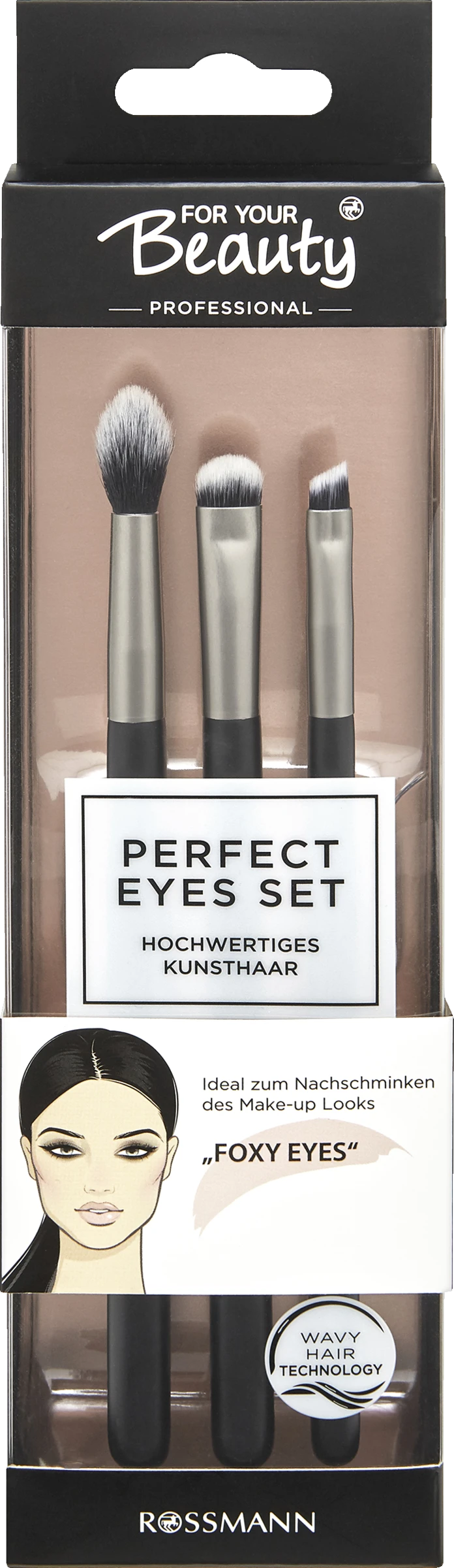 Das Perfect Eyes Set eignet sich ideal, um dem Auge einen gelifteten Cat Eye Efekt zu verleihen. Aufgrund der 3 perfekt aufeinander abgestimmten Pinsel aus hochwertigem Kunsthaar kann der Foxy Eye Look in Perfektion geschminkt werden.