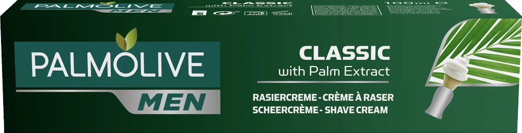 Palmolive Men Classic Rasiercreme ist angereichert mit Palmenextrakt. Die sanfte Formel hilft, Ihre Haut vor Rasurreizungen zu schützen. Der zarte, cremige Schaum mit Pflegeextrakte pflegt deine Haut schon während der Rasur und hält sie zart und geschmeidig.