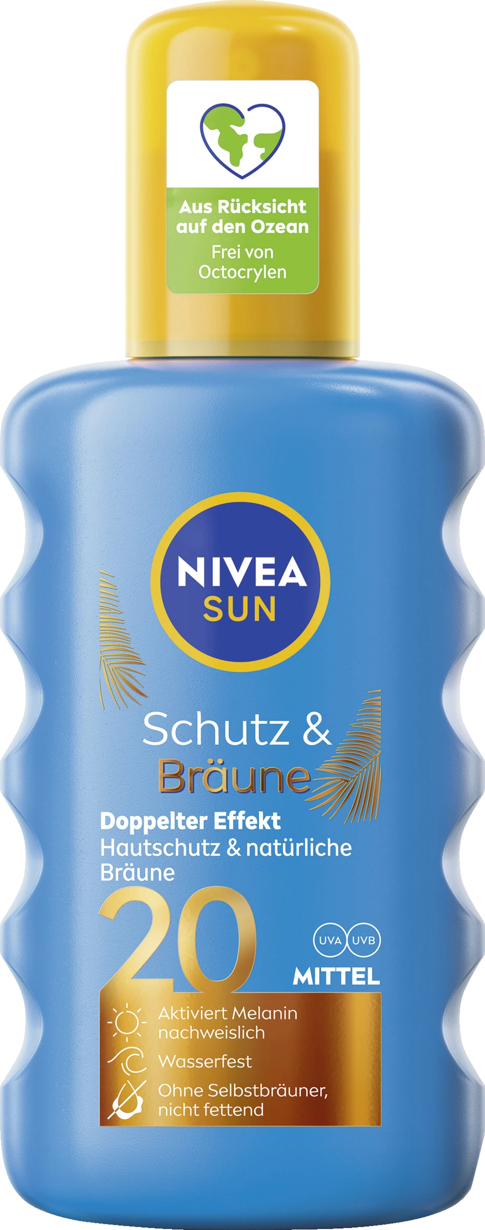Das Schutz & Bräune Sonnenspray mit LSF 20 lässt sich leicht aufsprühen, zieht schnell ein und fettet nicht. Die wasserfeste Formel mit natürlichem Pro-Melanin Extrakt aktiviert die natürliche Bräunung der Haut. Für eine langanhaltende, schöne Bräune, ganz ohne Selbstbräuner.