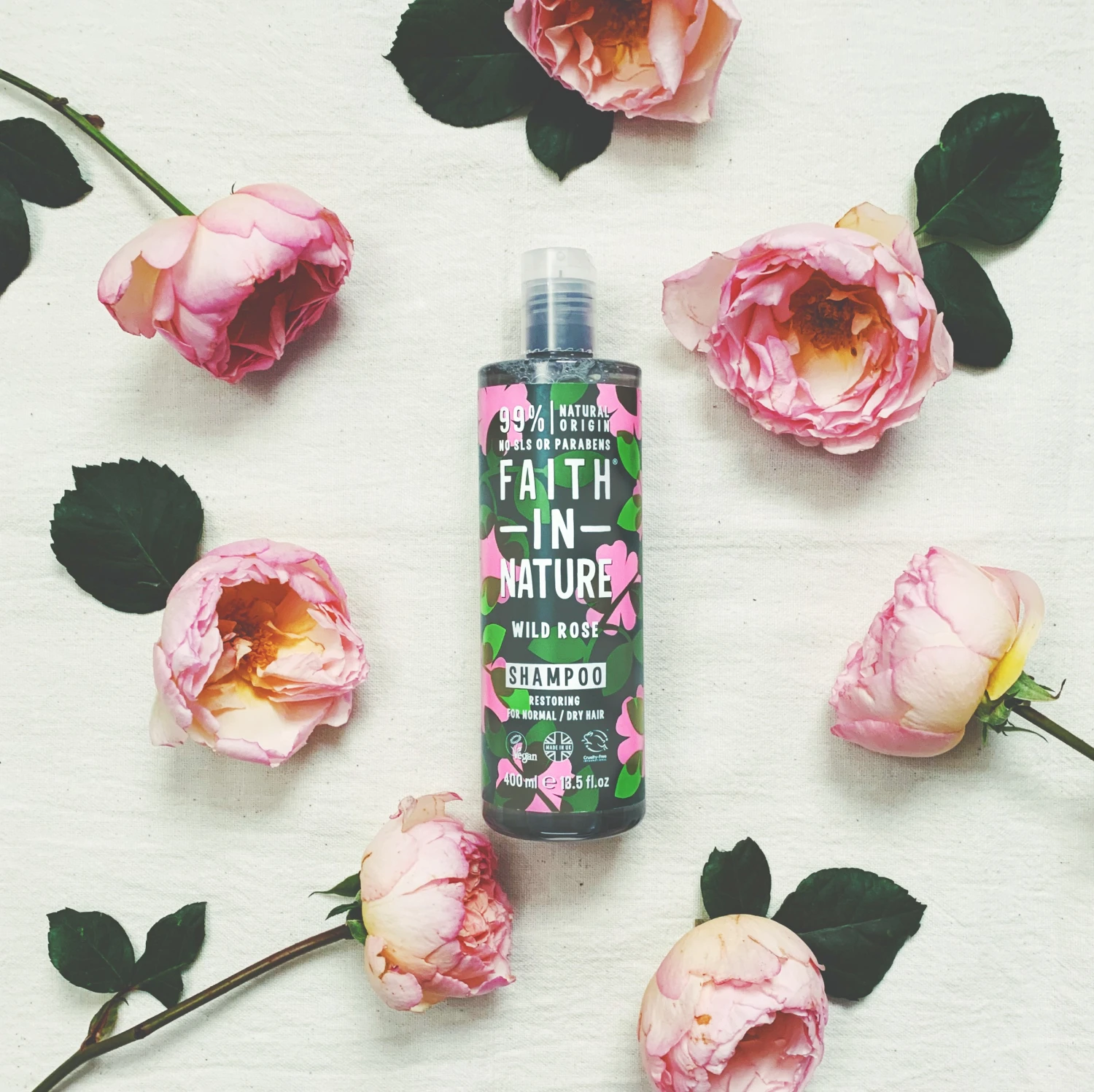 Das Shampoo ist mit Bio-Wildrosenöl angereichert für sauberes und gesünderes Haar und dem Duft frischer wilder Rosen.