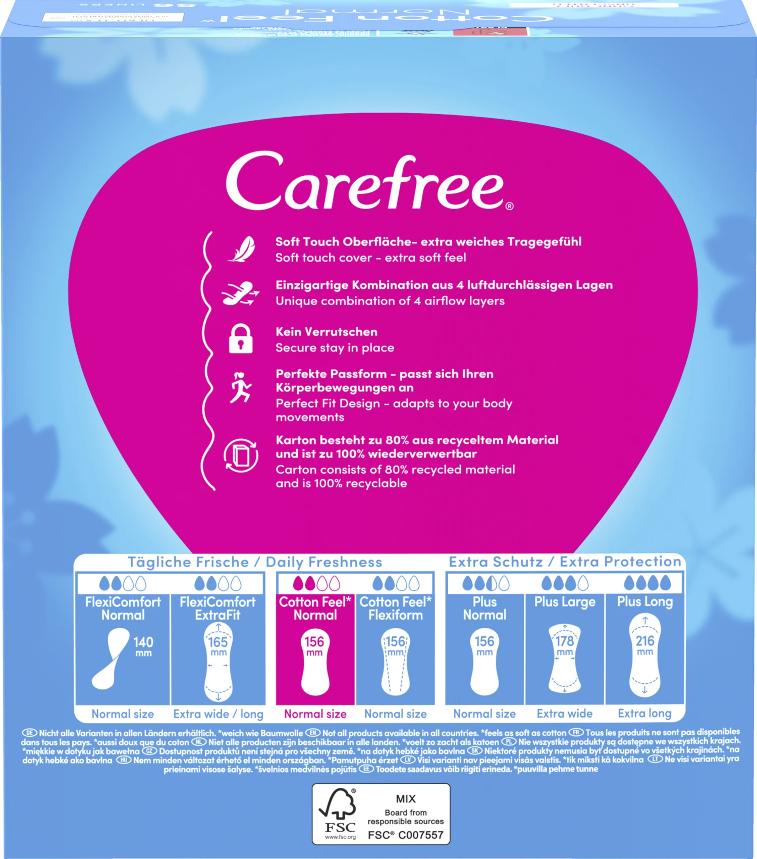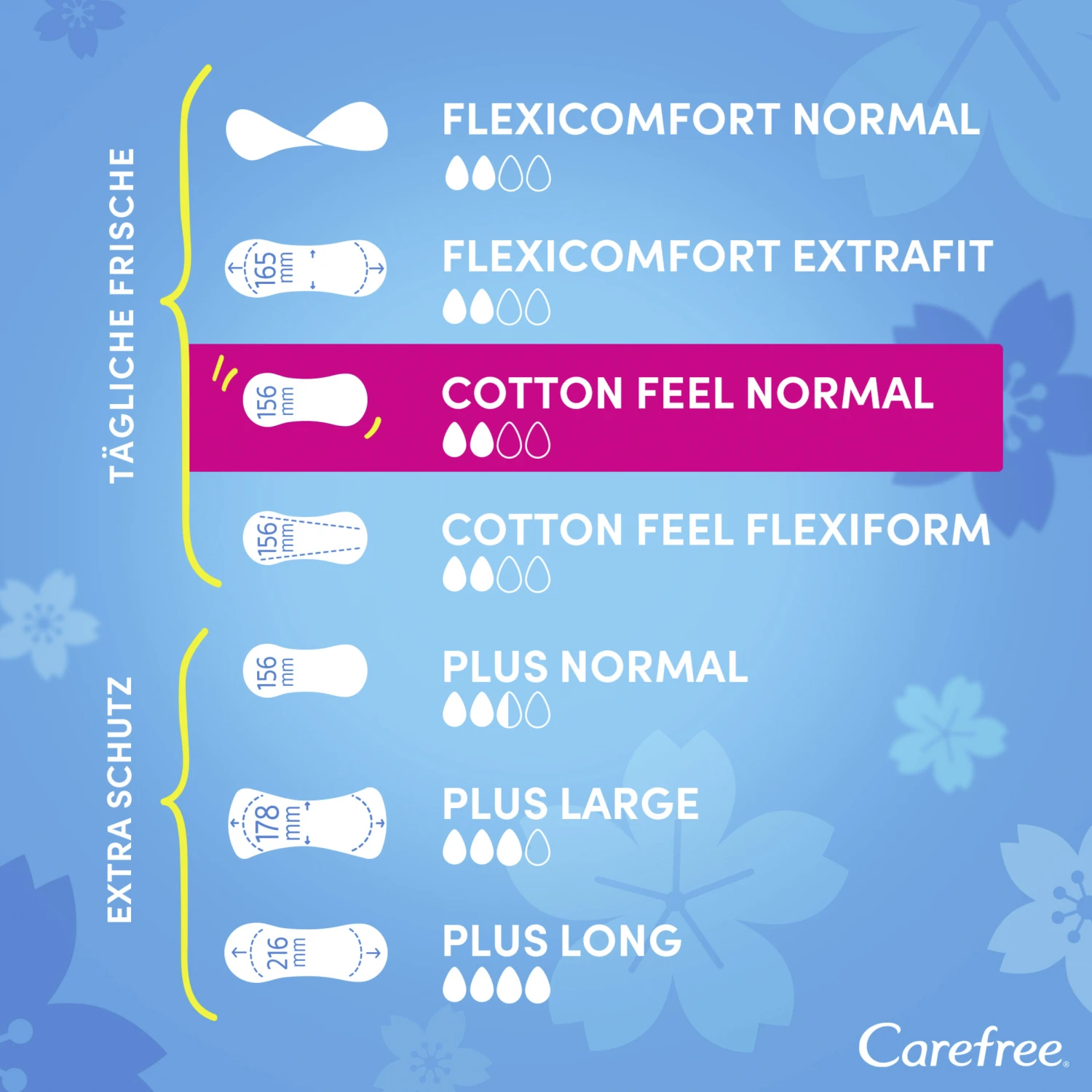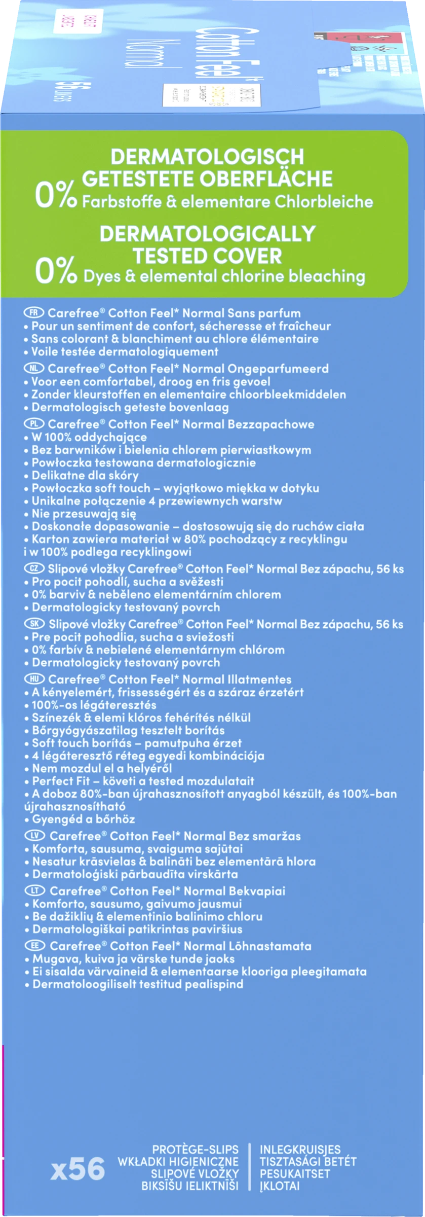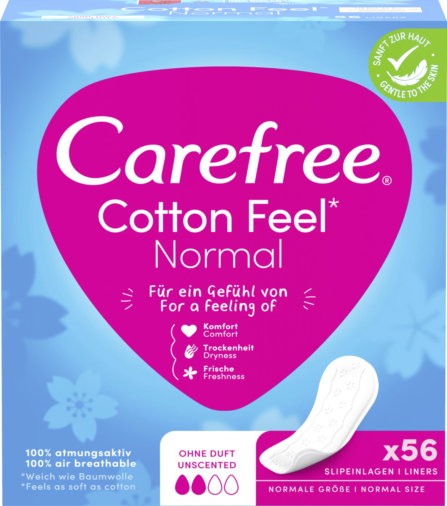 Die Carefree Slipeinlagen Cotton Feel Normal ohne Duft sind zu 100% atmungsaktiv für ein Gefühl von Komfort, Trockenheit und langanhaltende Frische. Zudem sind sie so weich wie Baumwolle. Die Soft Touch Oberfläche bietet ein extra weiches Tragegefühl und ist dermatologisch getestet. Die Passform passt sich perfekt den Körperbewegungen an.