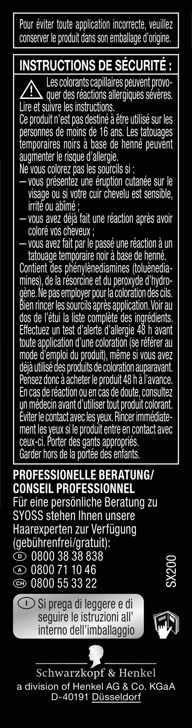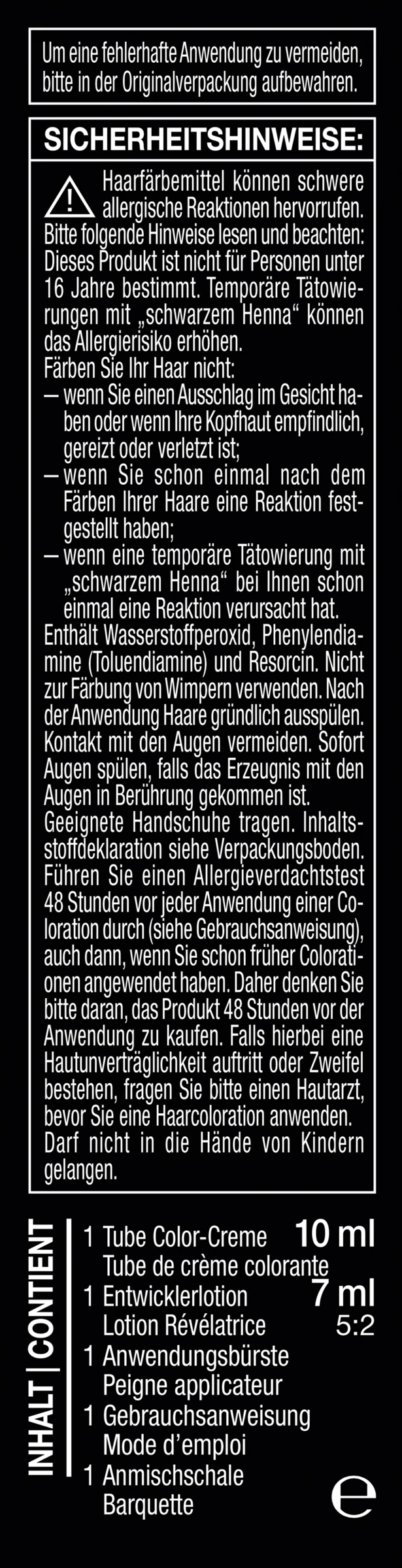 Haarfärbemittel können schwere allergische Reaktionen hervorrufen. Bitte folgende Hinweise lesen und beachten: Dieses Produkt ist nicht für Personen unter 16 Jahren bestimmt. Temporäre Tätowierungen mit „schwarzem Henna“ können das Allergierisiko erhöhen. Färben Sie ihr Haar nicht: