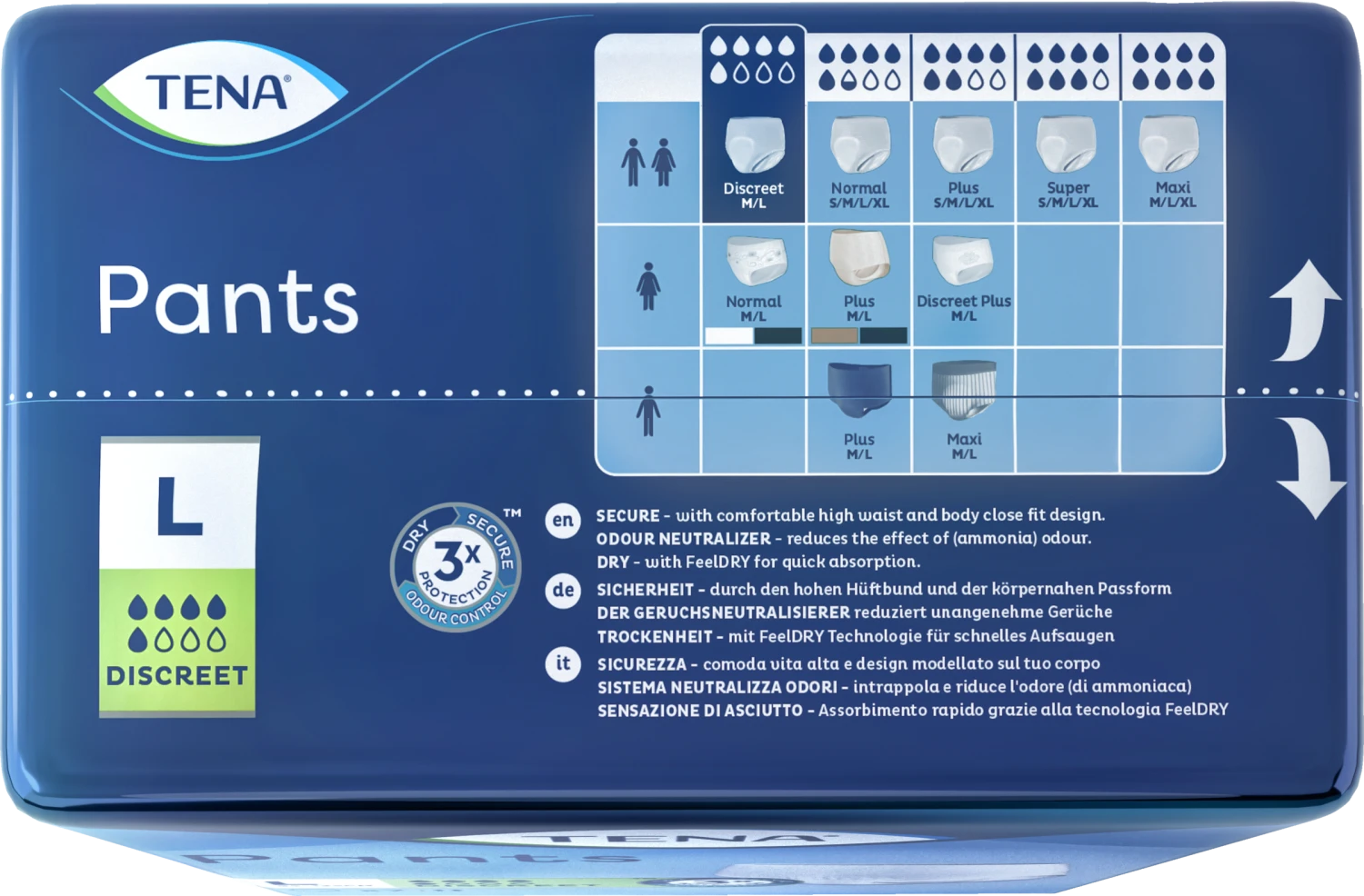 TENA Pants Discreet sind bequeme und weiche Einweghosen mit hohem Bund, die speziell für mittelstarke Blasenschwäche entwickelt wurden. Die hochleistungsfähigen, schützenden Einweghosen verfügen über eine feuchtigkeitsreduzierende Technologie, die Trockenheit und Schutz vor Auslaufen und Geruchsbildung bietet. Ihre elastische Form passt sich der Körperform perfekt an und garantiert einen besonders sicheren und diskreten Sitz, selbst unter enger Kleidung. Die Einweg-Inkontinenzhosen bestehen aus textilähnlichem, atmungsaktivem und außergewöhnlich saugfähigem Material. Ihre Pull-up-Passform sorgt für den guten, unterwäscheähnlichen Sitz und ermöglicht ihren Anwendern einen unabhängigen und aktiven Alltag.
