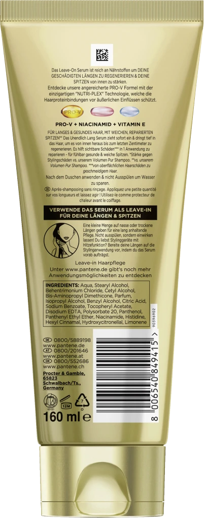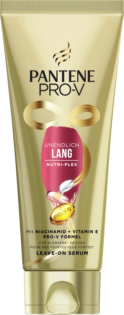Pantene Pro-V Unendlich Lang Leave-On Haarserum ist ein Serum für trockenes, geschädigtes Haar, das das Haar und seine Spitzen stärkt* und es schon nach einmaliger Anwendung gesünder aussehen lässt. Angereichert mit Niacinamid und Vitamin E verleiht die Leave-In Haarpflege dem Haar Feuchtigkeit und hilft dabei, geschädigtes Haar und Spliss zu reparieren**. Das Produkt schmilzt sofort im Haar und regeneriert jeden einzelnen Zentimeter davon. Die besten Resultate erzielen Sie mit der kompletten Haarpflegeroutine zusammen mit den anderen Pantene Pro-V Unendlich Lang Haarpflegeprodukten.